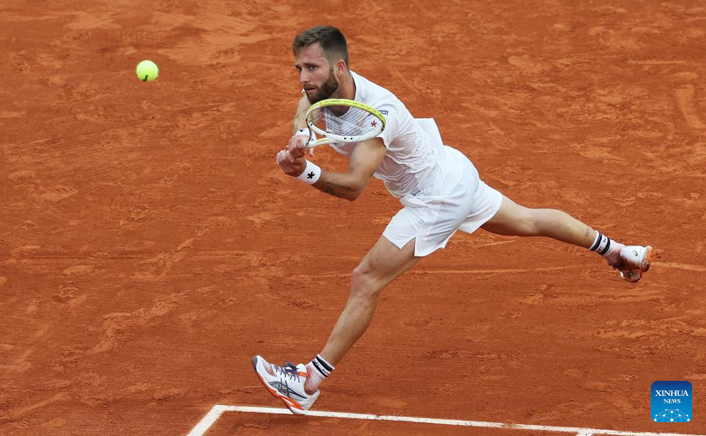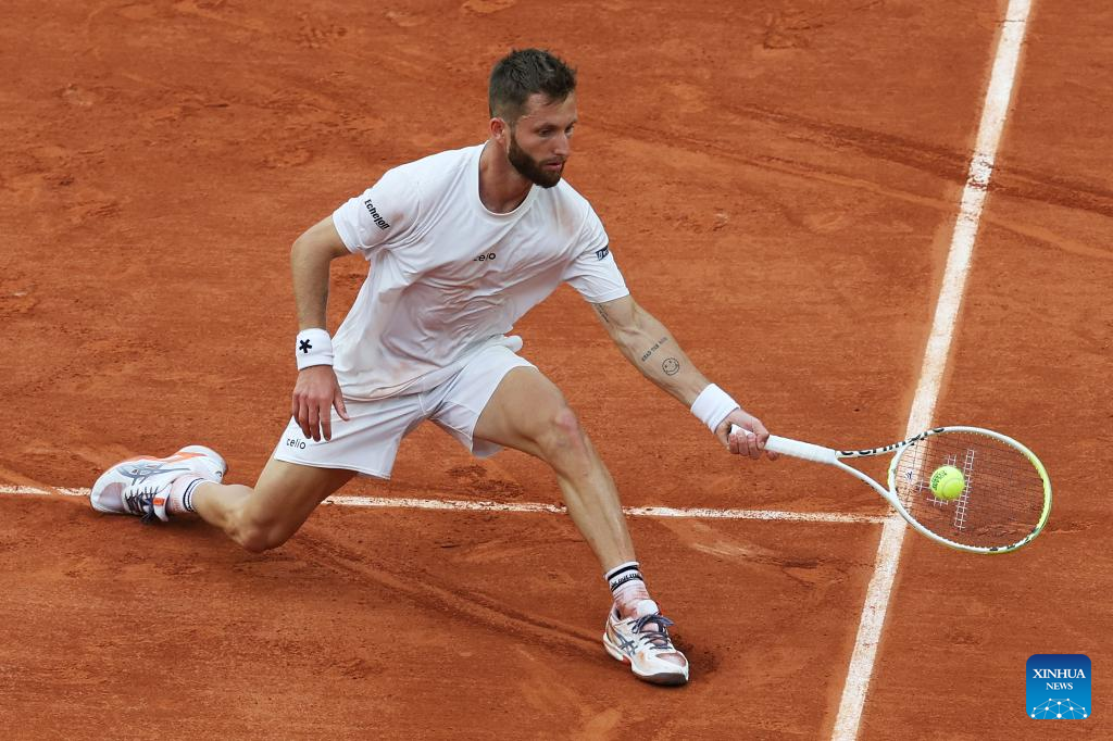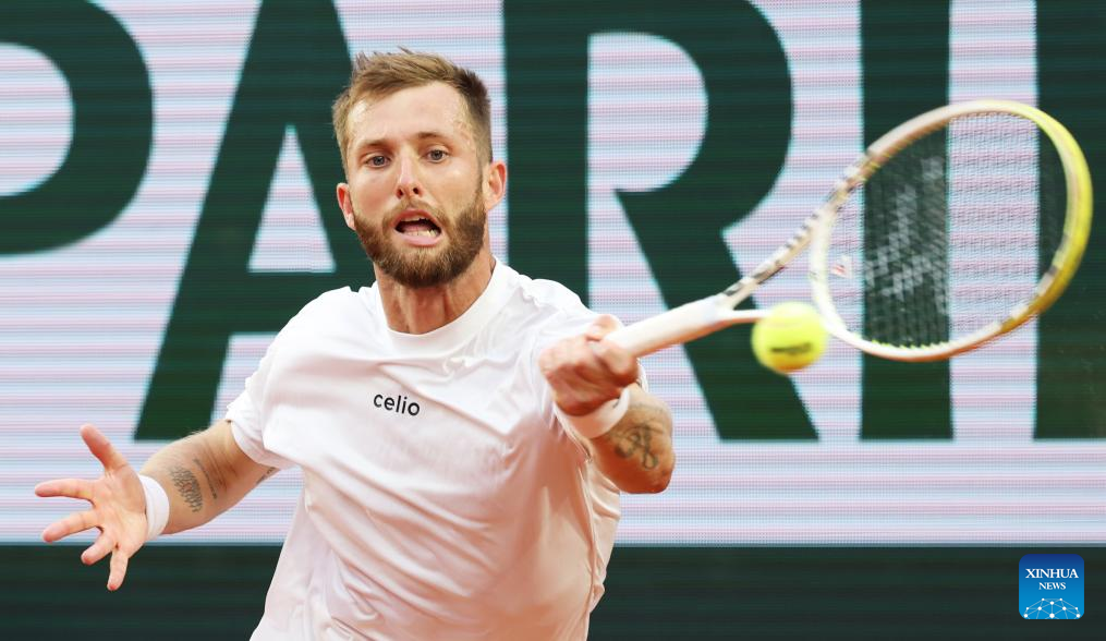Corentin Moutet of France hits a return during the men's singles second round match against Novak Djokovic of Serbia at French Open tennis tournament 2025 in Paris, France, May 29, 2025. (Xinhua/Gao Jing)