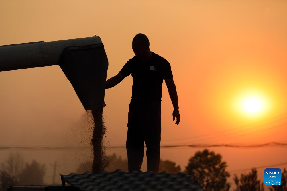 A farmer harvests wheat in a field in Dongjunying Village of Baofeng County, Pingdingshan City, central China's Henan Province, May 28, 2025. (Xinhua/Li Jianan)
