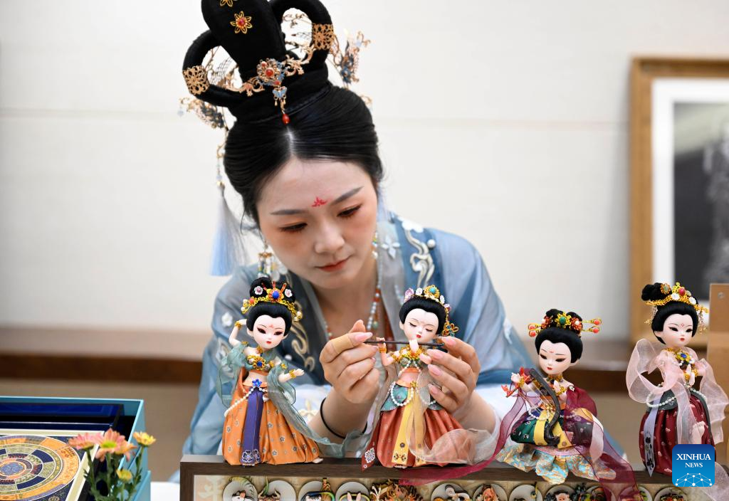 A woman arranges Dunhuang cultural theme exhibits after the opening ceremony of the fourth Dialogue on Exchanges and Mutual Learning among Civilizations in Dunhuang, northwest China's Gansu Province, May 30, 2025.