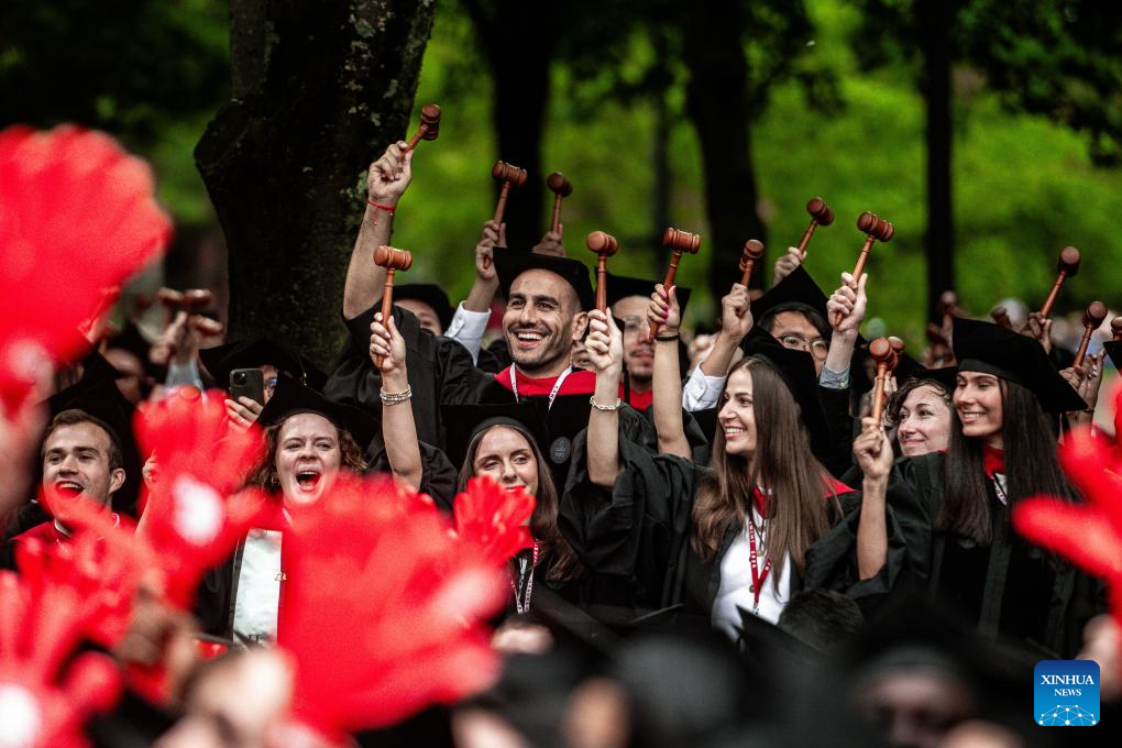Students cheer during commencement ceremony at Harvard University in Cambridge, Massachusetts, the United States, May 29, 2025.