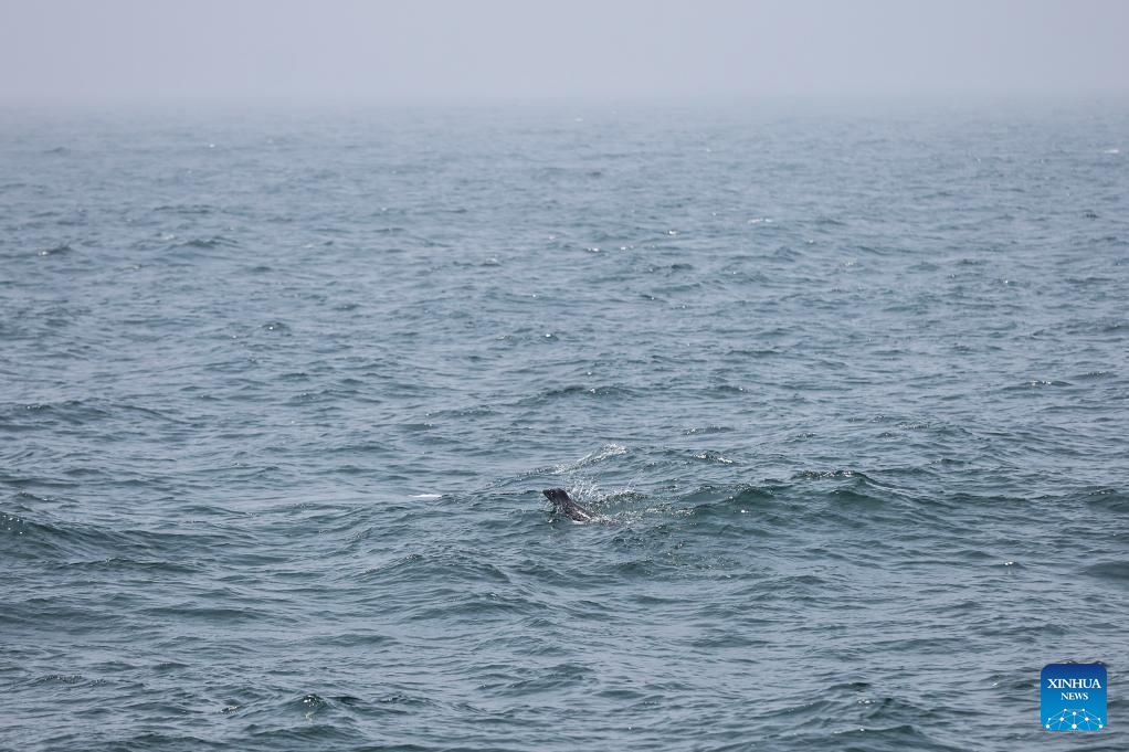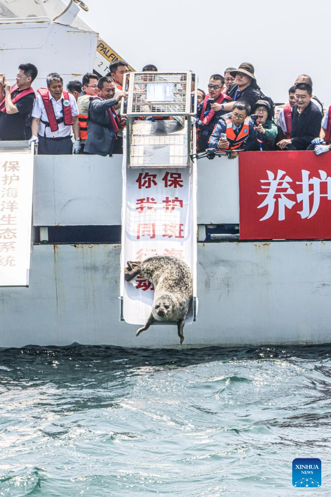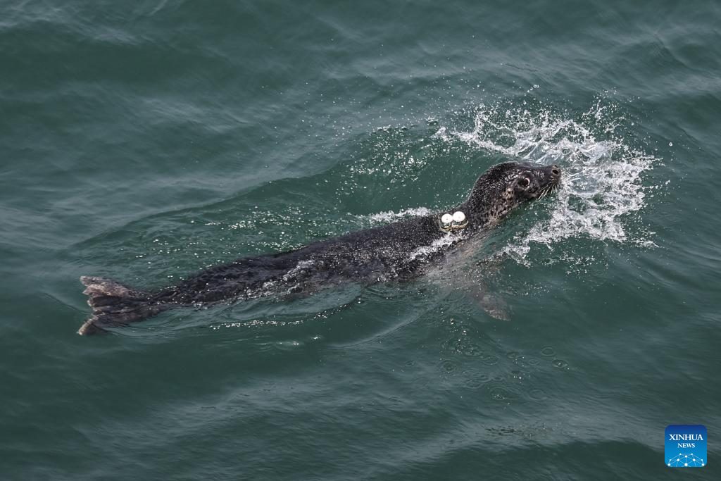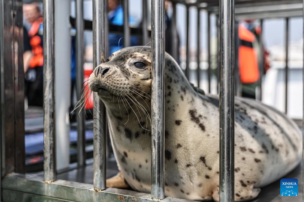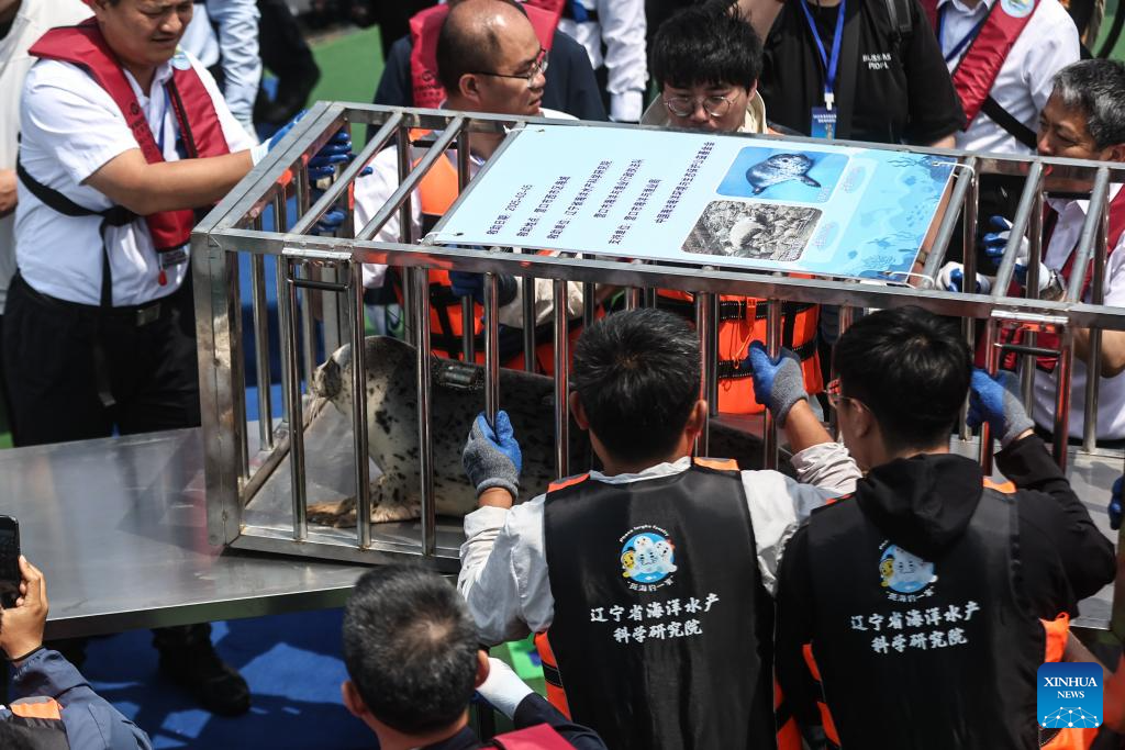 A spotted seal is released in the waters off Dalian, northeast China's Liaoning Province, June 6, 2025.