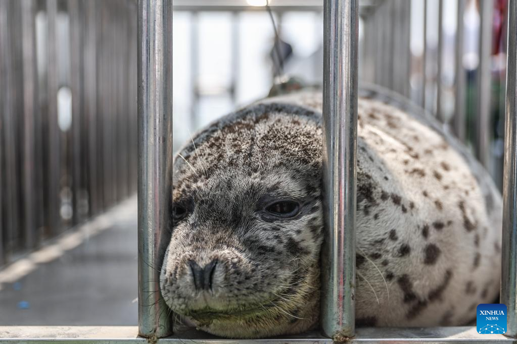 Staff members prepare to release a spotted seal in the waters off Dalian, northeast China's Liaoning Province, June 6, 2025.