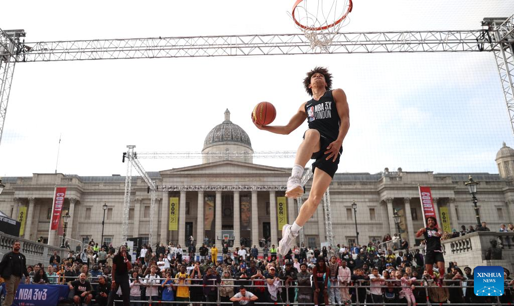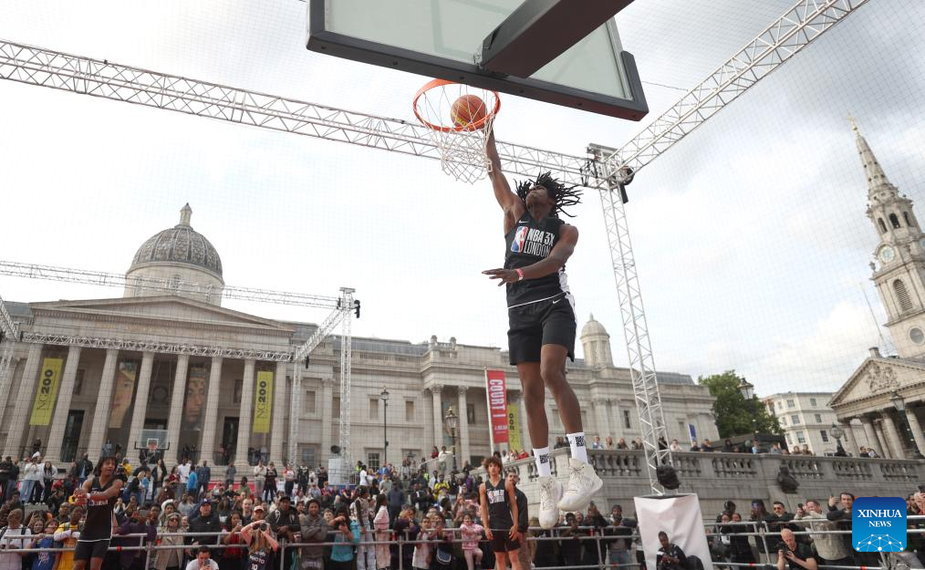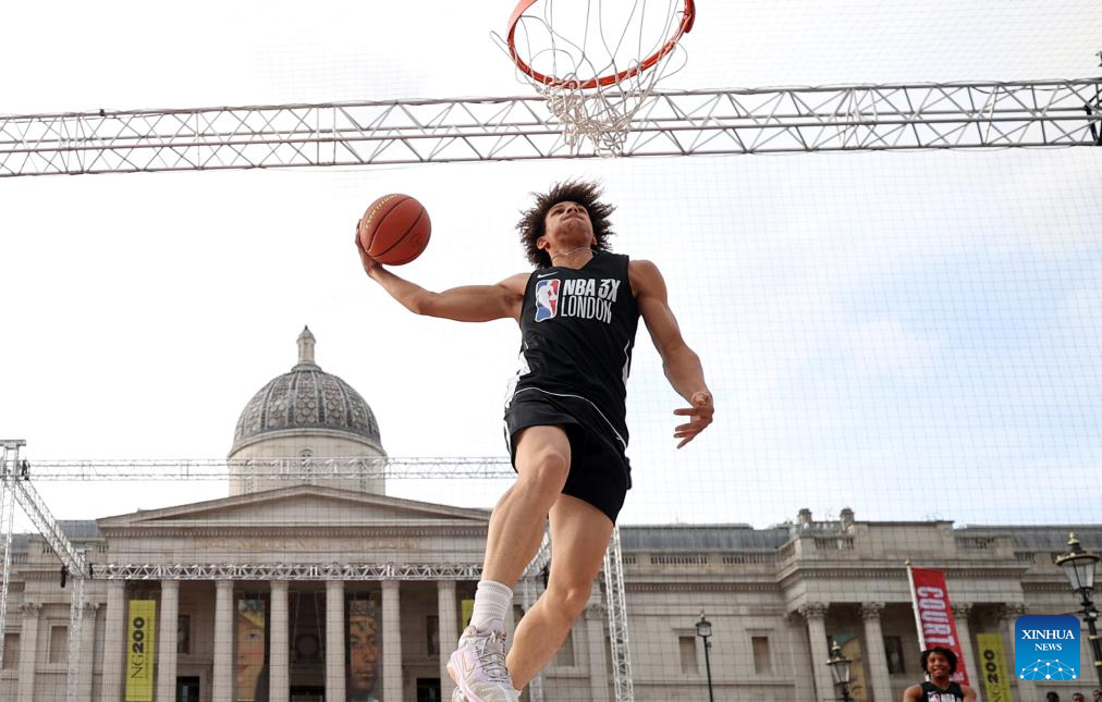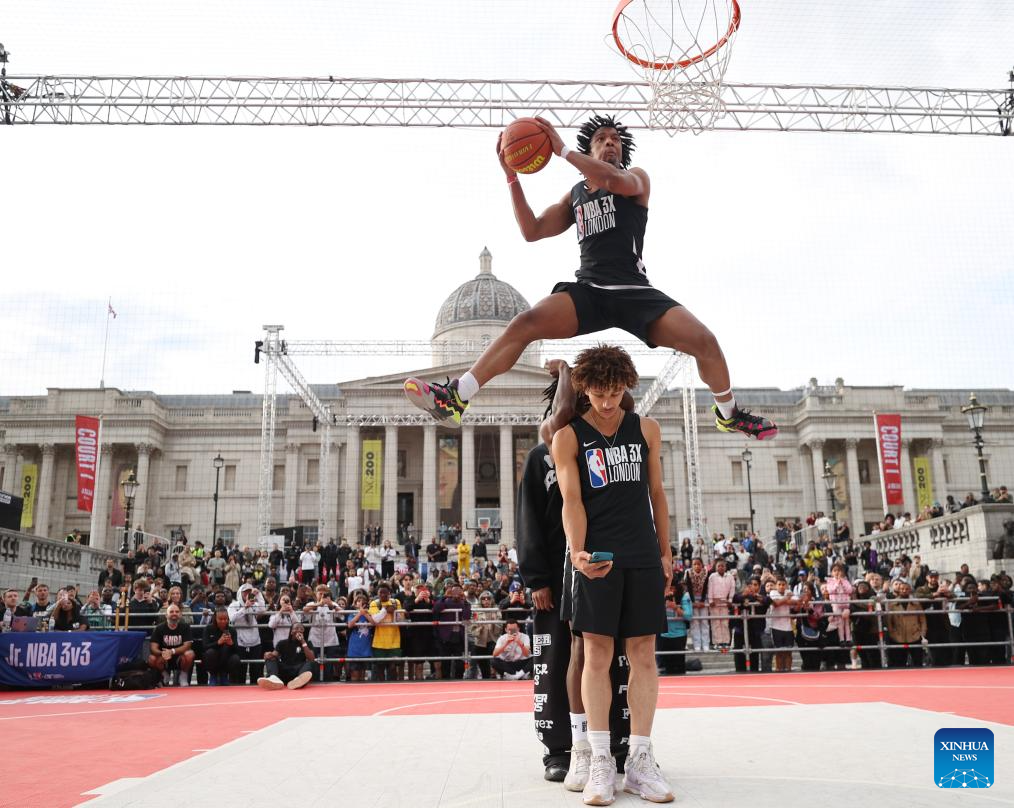 Claudor Matoko (Top) performs at the dunk show during Jr. NBA 3v3 tournament at Trafalgar Square in London, Britain, June 6, 2025. (Xinhua/Li Ying)