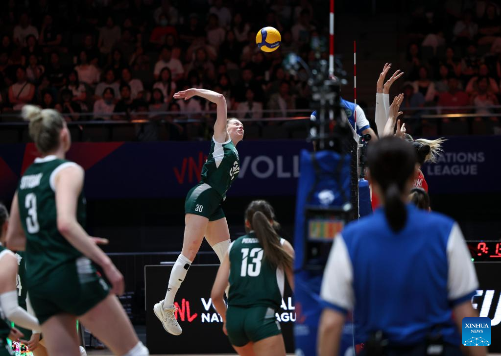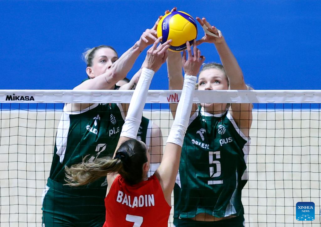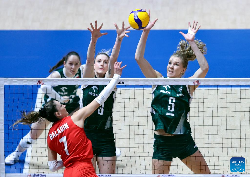 Olivia Rozanski (C) of Poland spikes the ball during the pool 3 match between Türkiye and Poland at the Women's Volleyball Nations League (VNL) 2025 Beijing at the National Indoor Stadium in Beijing, China, June 7, 2025. (Xinhua/Luo Yuan)