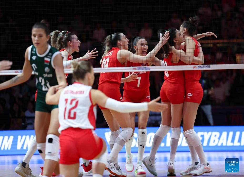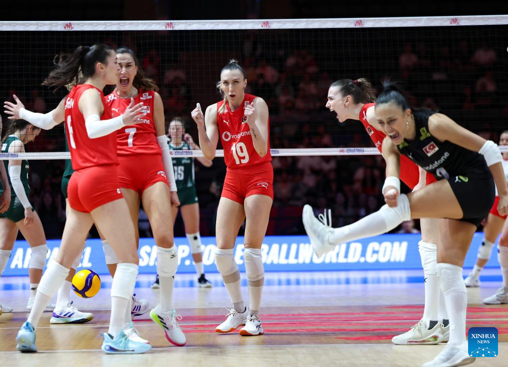 Players of Türkiye celebrate scoring during the pool 3 match between Türkiye and Poland at the Women's Volleyball Nations League (VNL) 2025 Beijing at the National Indoor Stadium in Beijing, China, June 7, 2025. (Xinhua/Luo Yuan)