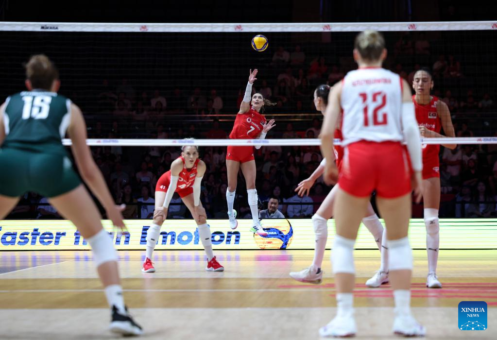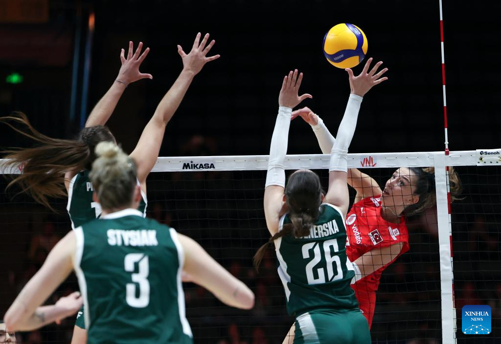 Hande Baladin (C) of Türkiye spikes the ball during the pool 3 match between Türkiye and Poland at the Women's Volleyball Nations League (VNL) 2025 Beijing at the National Indoor Stadium in Beijing, China, June 7, 2025. (Xinhua/Luo Yuan)