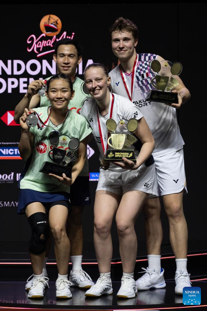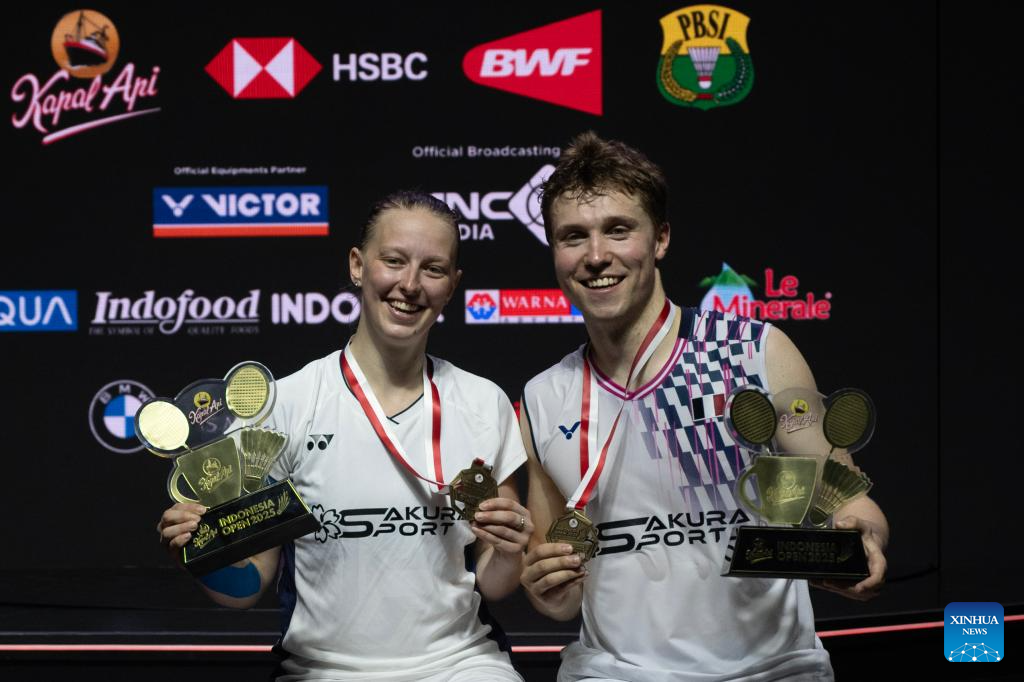 Winners Thom Gicquel (R)/Delphine Delrue pose during the awarding ceremony for the mixed doubles final match between Thom Gicquel/Delphine Delrue of France and Dechapol Puavaranukroh/Supissara Paewsampran of Thailand at Indonesia Open 2025 in Jakarta, Indonesia, June 8, 2025. (Xinhua/Veri Sanovri)