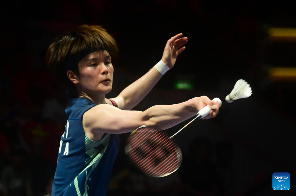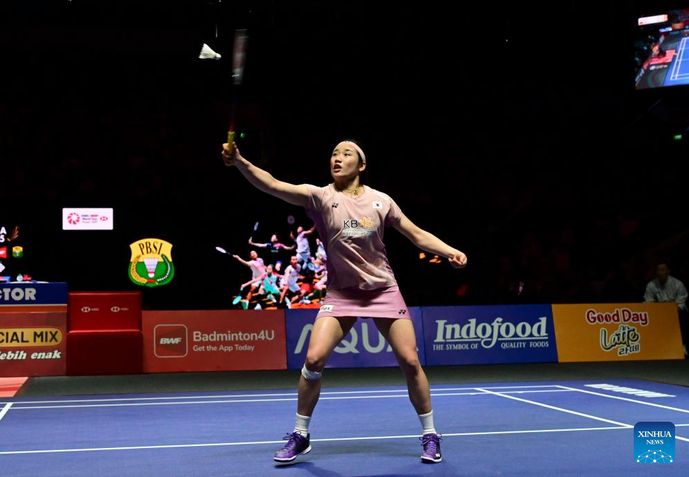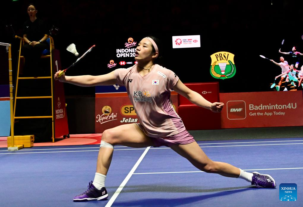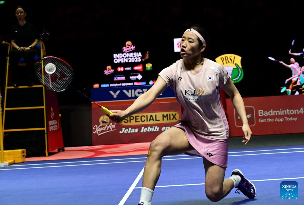 An Se Young hits a return during the women's singles final match between An Se Young of South Korea and Wang Zhiyi of China at Indonesia Open 2025 in Jakarta, Indonesia, June 8, 2025. (Xinhua/Zulkarnain)