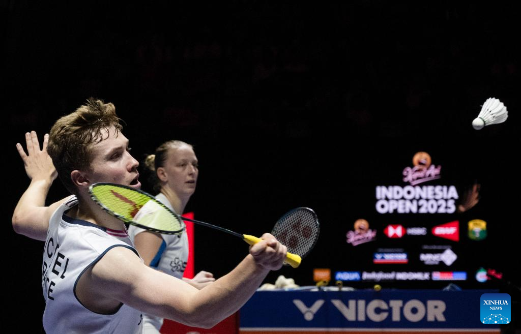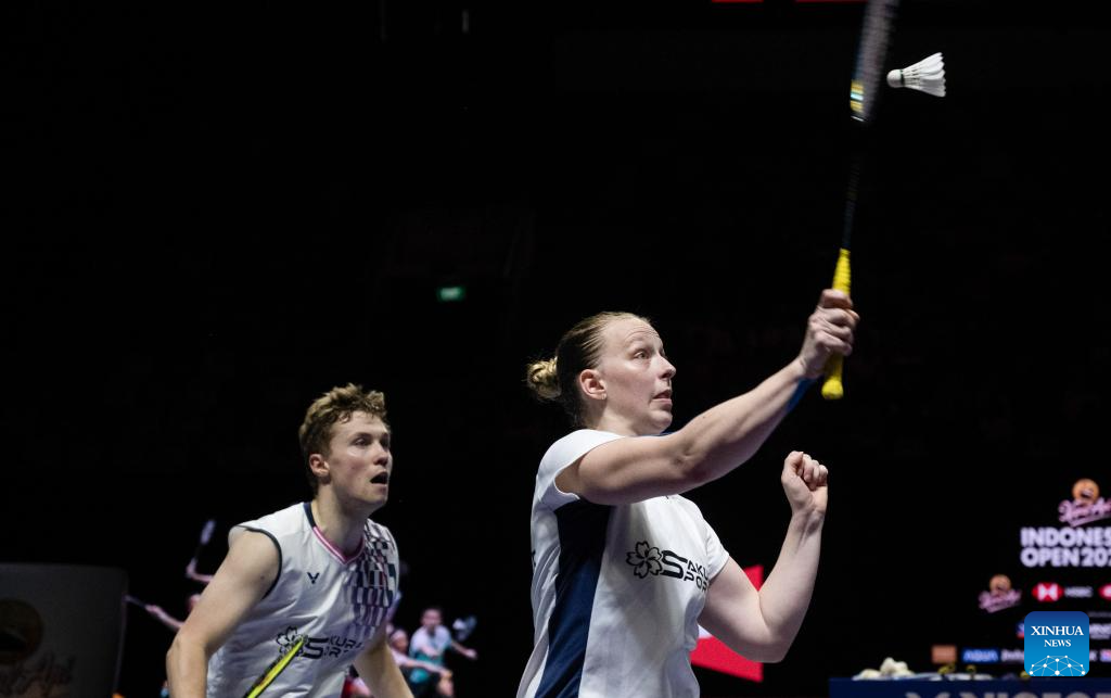 Thom Gicquel/Delphine Delrue (R) compete during the mixed doubles final match between Thom Gicquel/Delphine Delrue of France and Dechapol Puavaranukroh/Supissara Paewsampran of Thailand at Indonesia Open 2025 in Jakarta, Indonesia, June 8, 2025. (Xinhua/Veri Sanovri)
