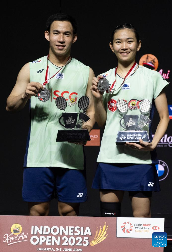Runner-up Dechapol Puavaranukroh (L)/Supissara Paewsampran pose during the awarding ceremony for the mixed doubles final match between Thom Gicquel/Delphine Delrue of France and Dechapol Puavaranukroh/Supissara Paewsampran of Thailand at Indonesia Open 2025 in Jakarta, Indonesia, June 8, 2025. (Xinhua/Veri Sanovri)