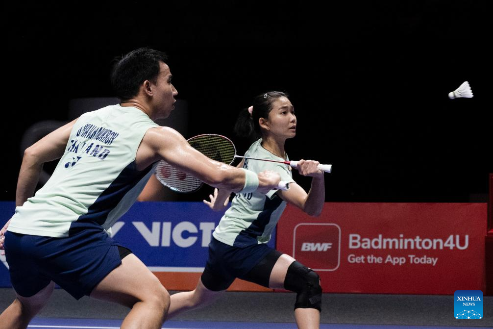 Dechapol Puavaranukroh/Supissara Paewsampran (R) compete during the mixed doubles final match between Thom Gicquel/Delphine Delrue of France and Dechapol Puavaranukroh/Supissara Paewsampran of Thailand at Indonesia Open 2025 in Jakarta, Indonesia, June 8, 2025. (Xinhua/Veri Sanovri)