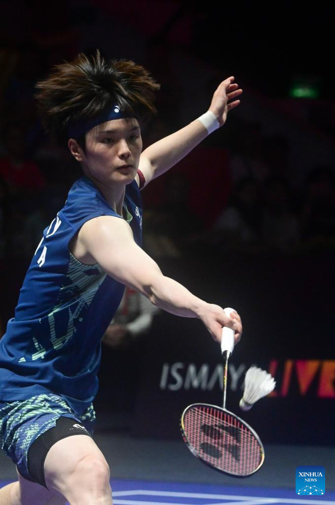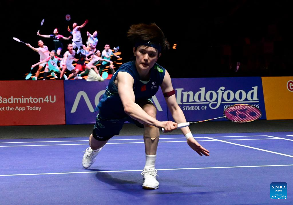 Wang Zhiyi hits a return during the women's singles final match between An Se Young of South Korea and Wang Zhiyi of China at Indonesia Open 2025 in Jakarta, Indonesia, June 8, 2025. (Xinhua/Zulkarnain)