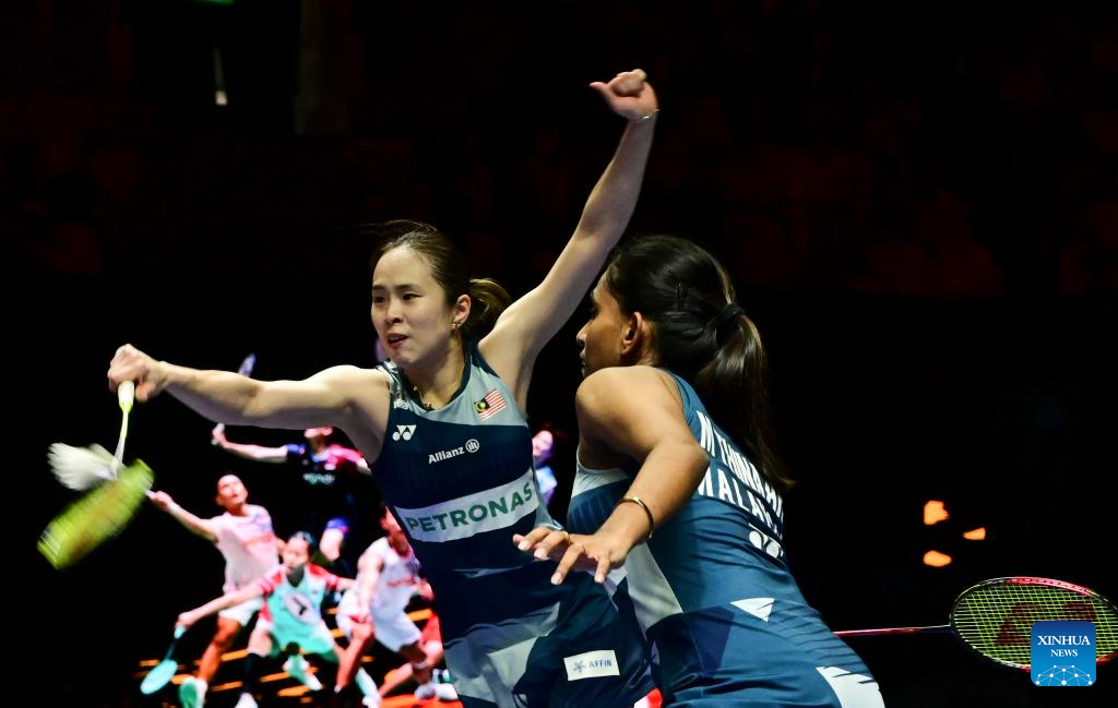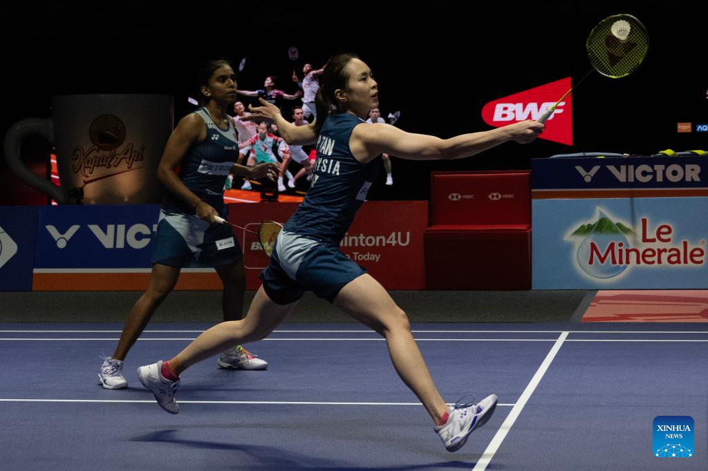 Pearly Tan (L)/Muralitharan Thinaah compete during the women's doubles final match between Liu Shengshu/Tan Ning of China and Pearly Tan/Muralitharan Thinaah of Malaysia at Indonesia Open 2025 in Jakarta, Indonesia, June 8, 2025. (Xinhua/Veri Sanovri)