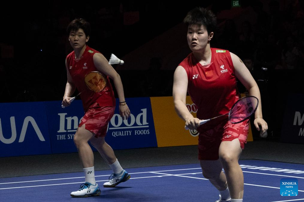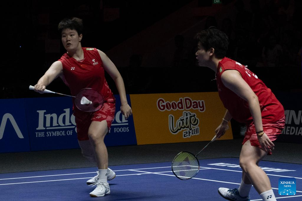 Liu Shengshu/Tan Ning (R) compete during the women's doubles final match between Liu Shengshu/Tan Ning of China and Pearly Tan/Muralitharan Thinaah of Malaysia at Indonesia Open 2025 in Jakarta, Indonesia, June 8, 2025. (Xinhua/Zulkarnain)