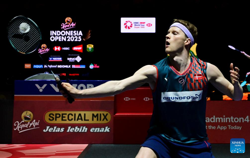 Anders Antonsen hits a return during the men's singles final between Anders Antonsen of Denmark and Chou Tien-Chen of Chinese Taipei at Indonesia Open 2025 in Jakarta, Indonesia, June 8, 2025. (Xinhua/Zulkarnain)