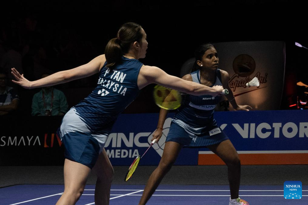 Pearly Tan(L)/Muralitharan Thinaah compete during the women's doubles final match between Liu Shengshu/Tan Ning of China and Pearly Tan/Muralitharan Thinaah of Malaysia at Indonesia Open 2025 in Jakarta, Indonesia, June 8, 2025. (Xinhua/Zulkarnain)