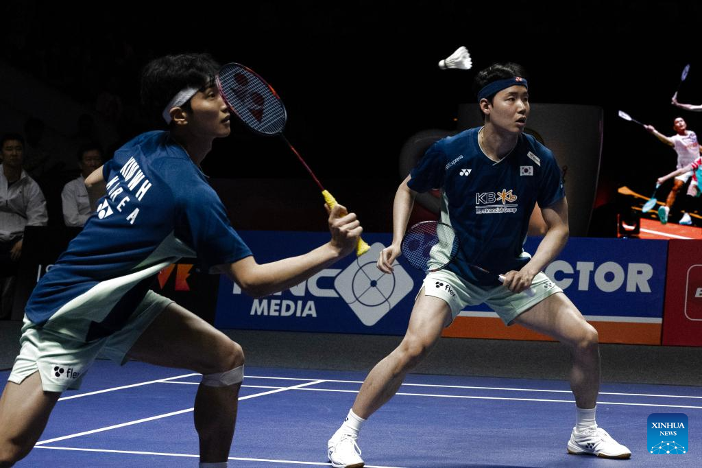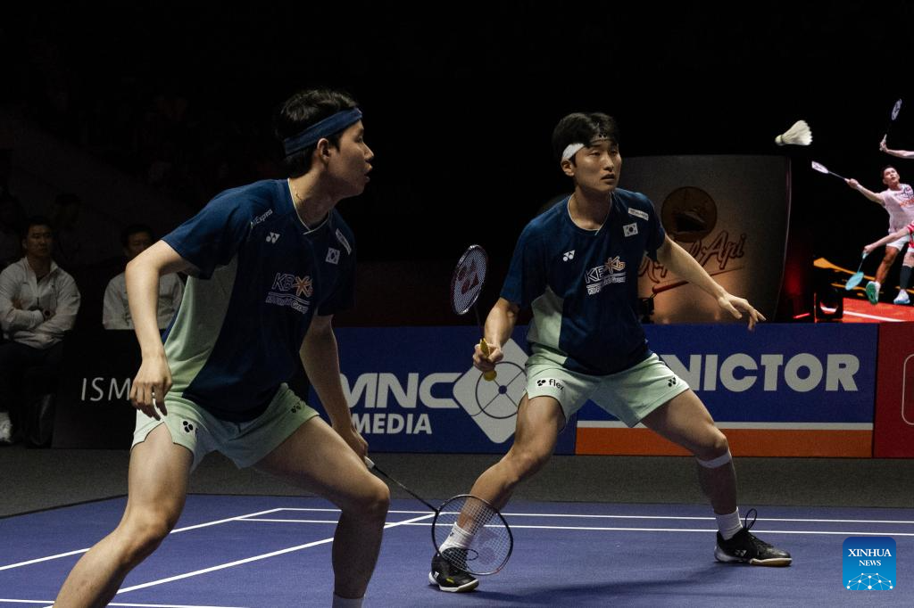 Kim Won Ho (R)/Seo Seung Jae compete during the men's doubles final match between Kim Won Ho/Seo Seung Jae of South Korea and Sabar Karyaman Gutama/Moh Reza Pahlevi Isfahani of Indonesia at Indonesia Open 2025 in Jakarta, Indonesia, June 8, 2025. (Xinhua/Veri Sanovri)