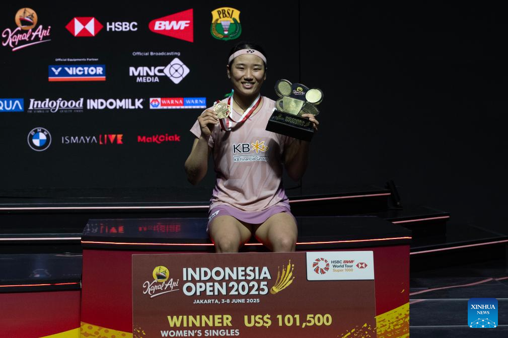 Winner An Se Young poses for photos during the awarding ceremony after the women's singles final match between An Se Young of South Korea and Wang Zhiyi of China at Indonesia Open 2025 in Jakarta, Indonesia, June 8, 2025. (Xinhua/Veri Sanovri)