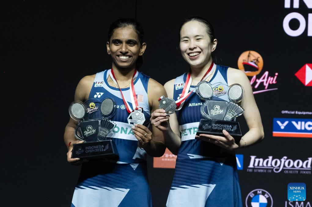 Runners-up Pearly Tan (R)/Muralitharan Thinaah pose for photos during the awarding ceremony after the women's doubles final match between Liu Shengshu/Tan Ning of China and Pearly Tan/Muralitharan Thinaah of Malaysia at Indonesia Open 2025 in Jakarta, Indonesia, June 8, 2025. (Xinhua/Veri Sanovri)