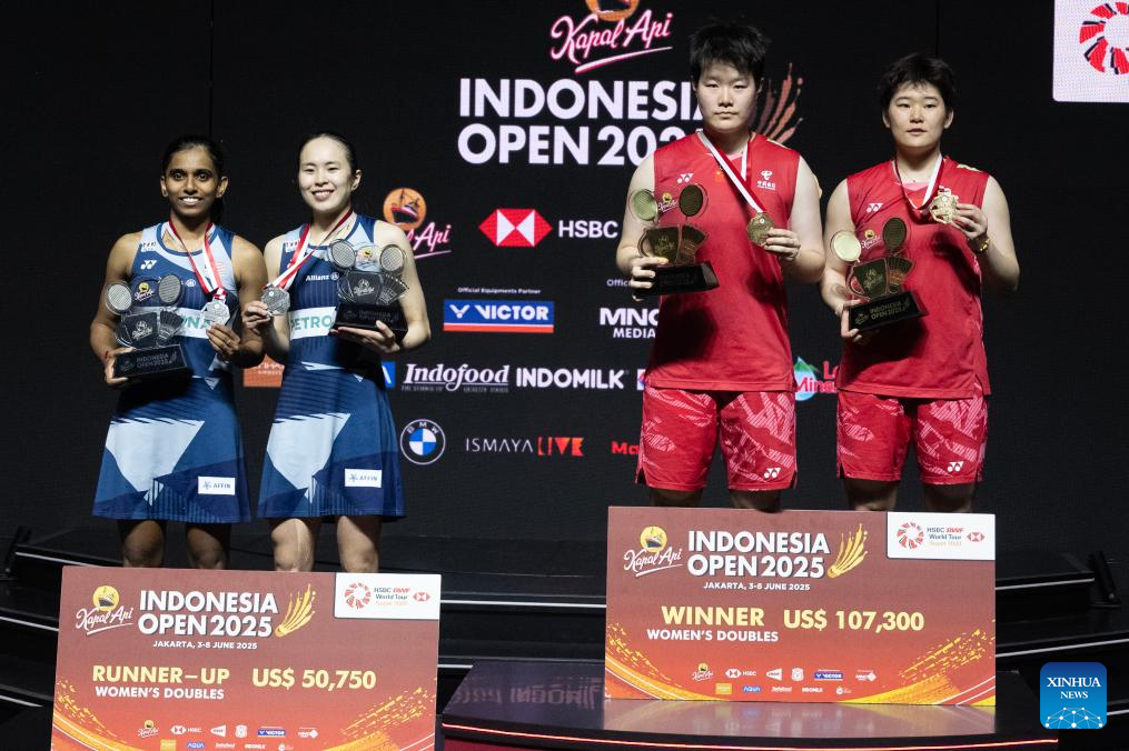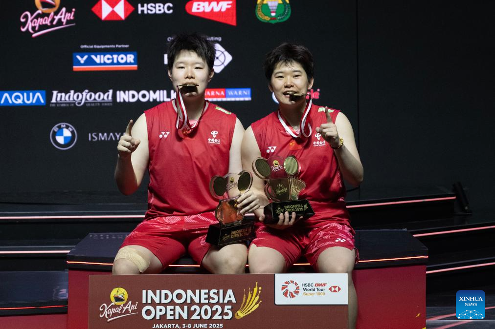 First-placed Liu Shengshu (L)/Tan Ning pose for photos during the awarding ceremony after the women's doubles final match between Liu Shengshu/Tan Ning of China and Pearly Tan/Muralitharan Thinaah of Malaysia at Indonesia Open 2025 in Jakarta, Indonesia, June 8, 2025. (Xinhua/Veri Sanovri)