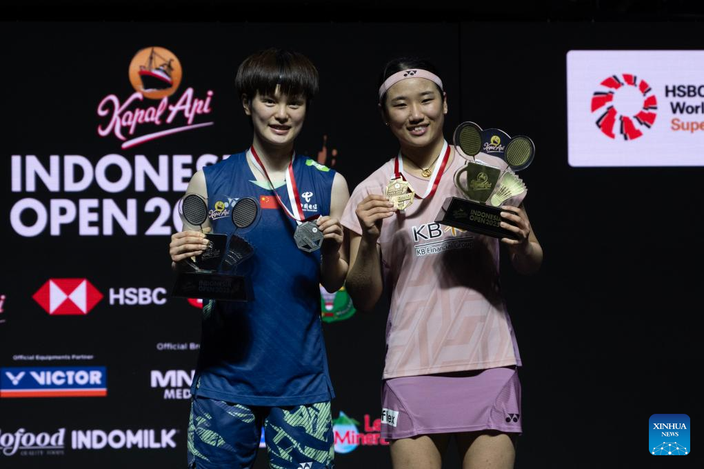 Winner An Se Young (R) of South Korea and runner-up Wang Zhiyi of China pose for photos during the awarding ceremony after their women's singles final match at Indonesia Open 2025 in Jakarta, Indonesia, June 8, 2025. (Xinhua/Veri Sanovri)