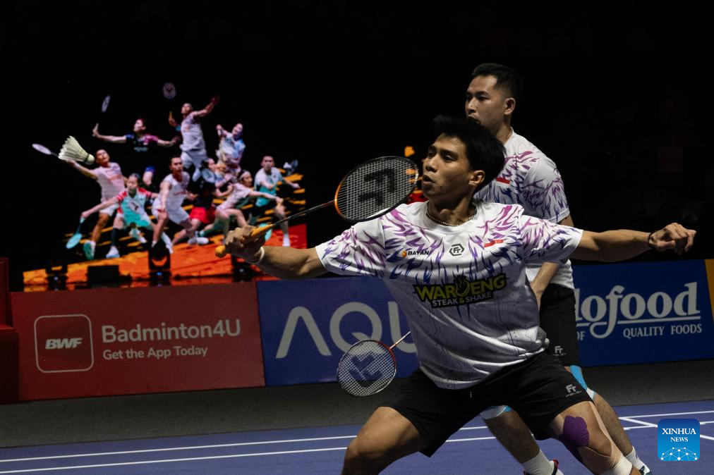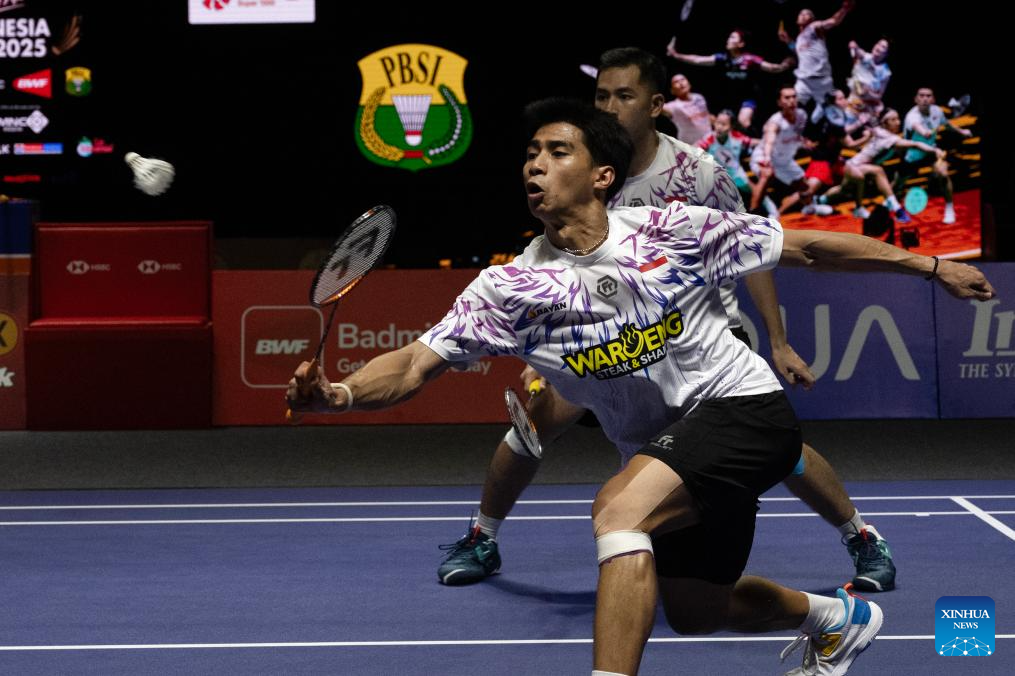 Sabar Karyaman Gutama (Front)/Moh Reza Pahlevi Isfahani compete during the men's doubles final match between Kim Won Ho/Seo Seung Jae of South Korea and Sabar Karyaman Gutama/Moh Reza Pahlevi Isfahani of Indonesia at Indonesia Open 2025 in Jakarta, Indonesia, June 8, 2025. (Xinhua/Veri Sanovri)