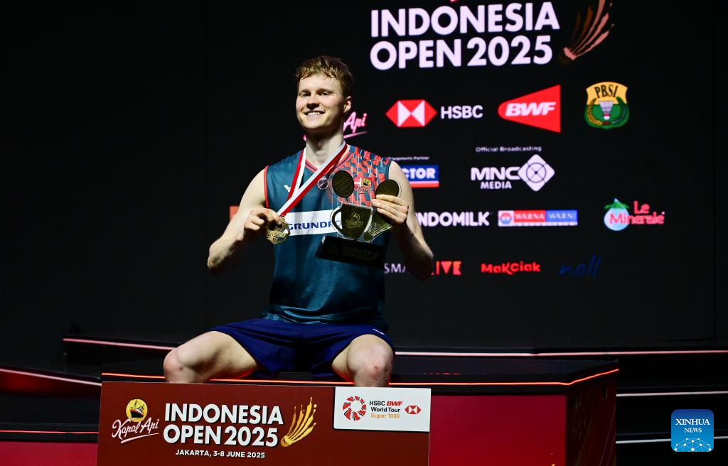 First-placed Anders Antonsen celebrates during the awarding ceremony after the men's singles final between Anders Antonsen of Denmark and Chou Tien-Chen of Chinese Taipei at Indonesia Open 2025 in Jakarta, Indonesia, June 8, 2025. (Xinhua/Zulkarnain)