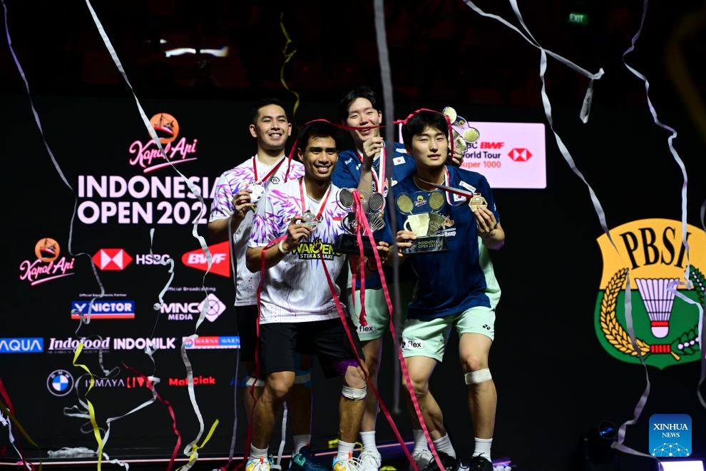 First-placed Kim Won Ho (R, Front)/Seo Seung Jae (R, Rear) of South Korea and runners-up Sabar Karyaman Gutama (L, Front)/Moh Reza Pahlevi Isfahani of Indonesia pose for photos during the awarding ceremony for men's doubles at Indonesia Open 2025 in Jakarta, Indonesia, June 8, 2025. (Xinhua/Zulkarnain)