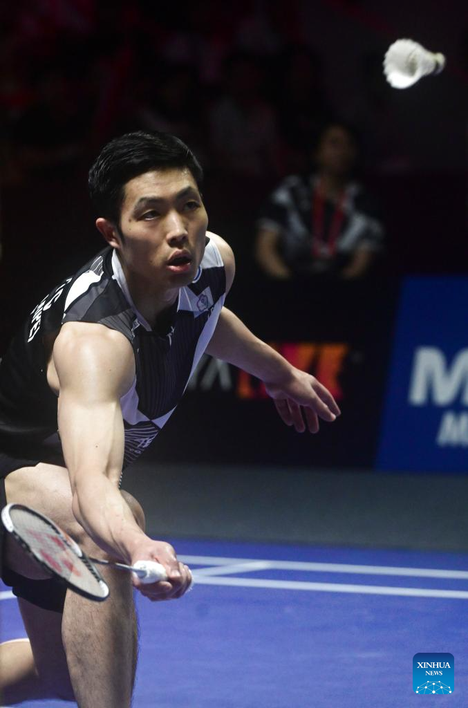 Chou Tien-Chen hits a return during the men's singles final between Anders Antonsen of Denmark and Chou Tien-Chen of Chinese Taipei at Indonesia Open 2025 in Jakarta, Indonesia, June 8, 2025. (Xinhua/Zulkarnain)