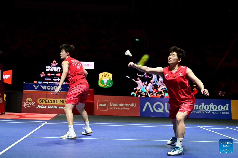Liu Shengshu (R)/Tan Ning compete during the women's doubles final match between Liu Shengshu/Tan Ning of China and Pearly Tan/Muralitharan Thinaah of Malaysia at Indonesia Open 2025 in Jakarta, Indonesia, June 8, 2025. (Xinhua/Veri Sanovri)