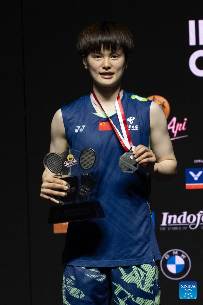 Runner-up Wang Zhiyi poses for photos during the awarding ceremony after the women's singles final match between An Se Young of South Korea and Wang Zhiyi of China at Indonesia Open 2025 in Jakarta, Indonesia, June 8, 2025. (Xinhua/Veri Sanovri)