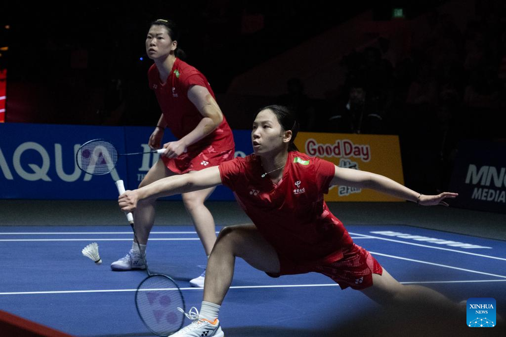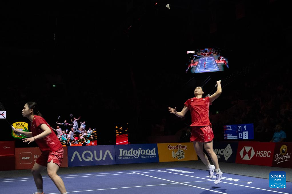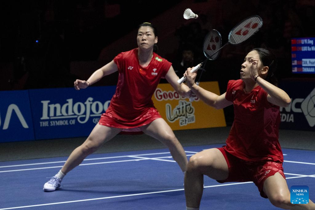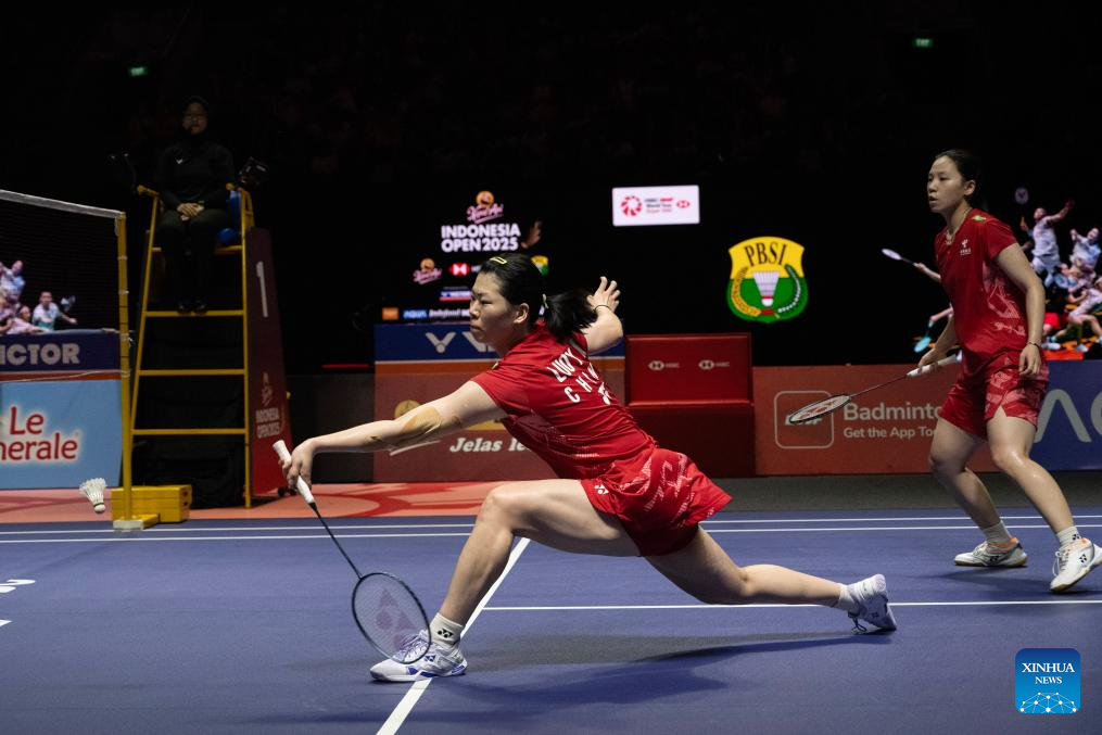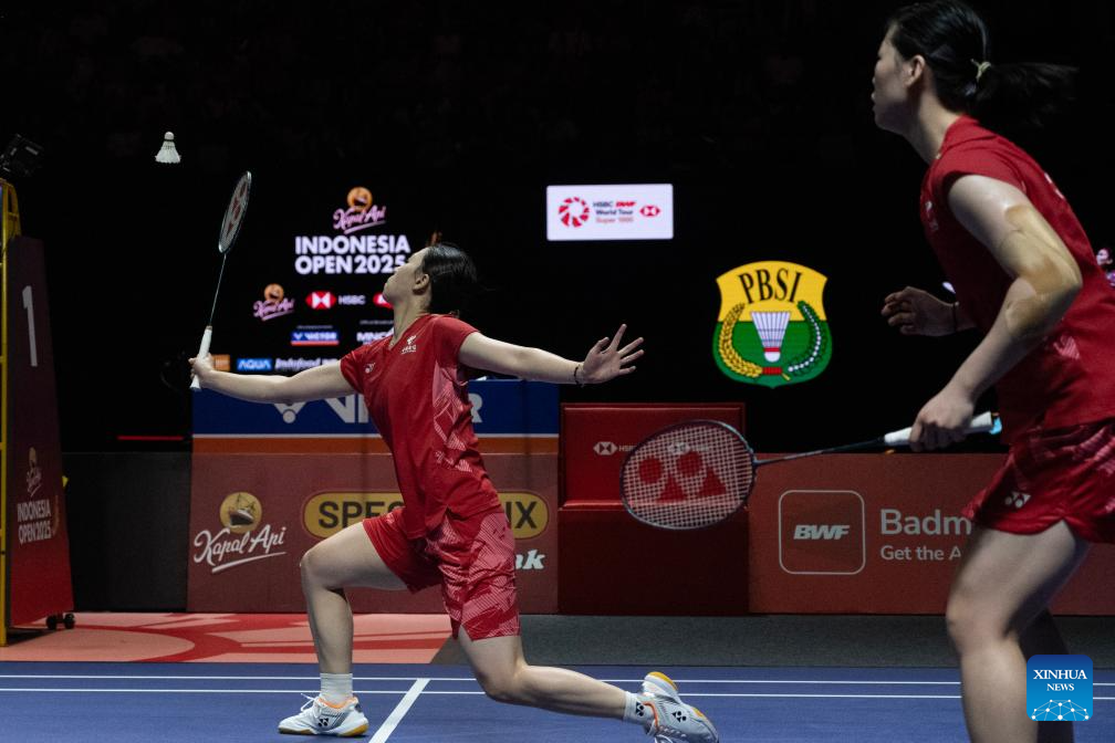 Li Yijing/Luo Xumin (L) of China compete against Pearly Tan/Muralitharan Thinaah of Malaysia during their women's doubles semifinal match at Indonesia Open 2025 badminton tournament in Jakarta, Indonesia, June 7, 2025. (Xinhua/Veri Sanovri)