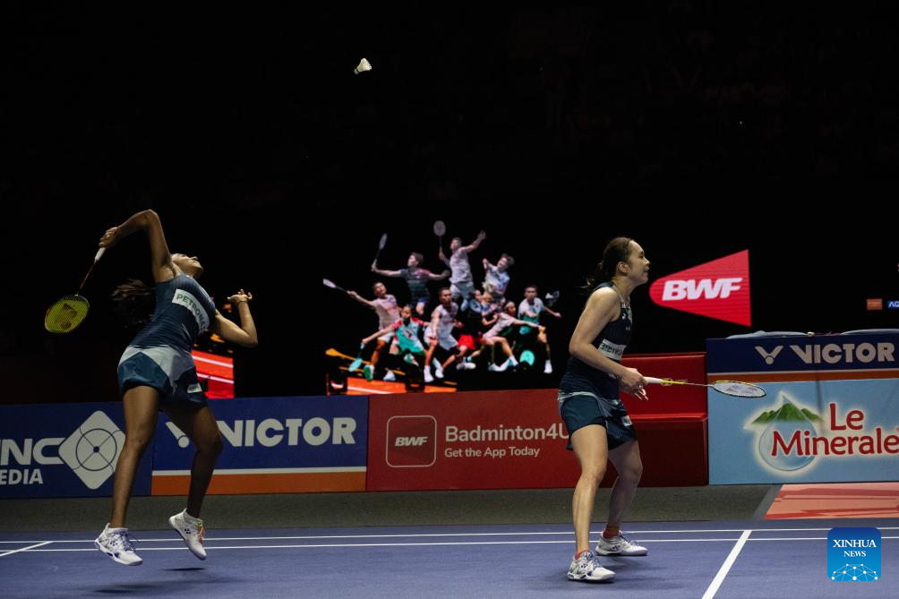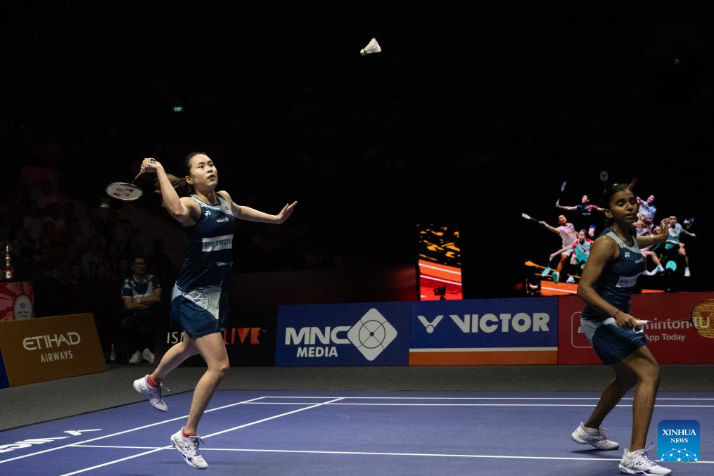 Pearly Tan (R)/Muralitharan Thinaah of Malaysia compete against Li Yijing/Luo Xumin of China during their women's doubles semifinal match at Indonesia Open 2025 badminton tournament in Jakarta, Indonesia, June 7, 2025. (Xinhua/Veri Sanovri)