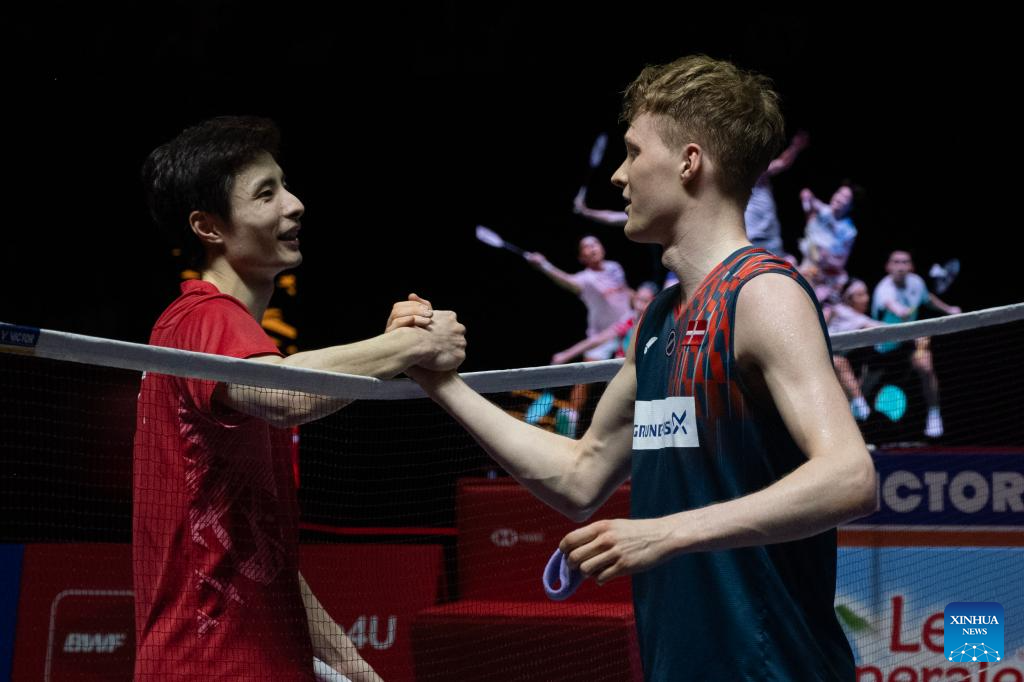 Shi Yuqi (L) and Anders Antonsen greet each other after the men's singles semi-final match between Shi Yuqi of China and Anders Antonsen of Denmark at Indonesia Open 2025 in Jakarta, Indonesia, June 7, 2025. (Xinhua/Veri Sanovri)