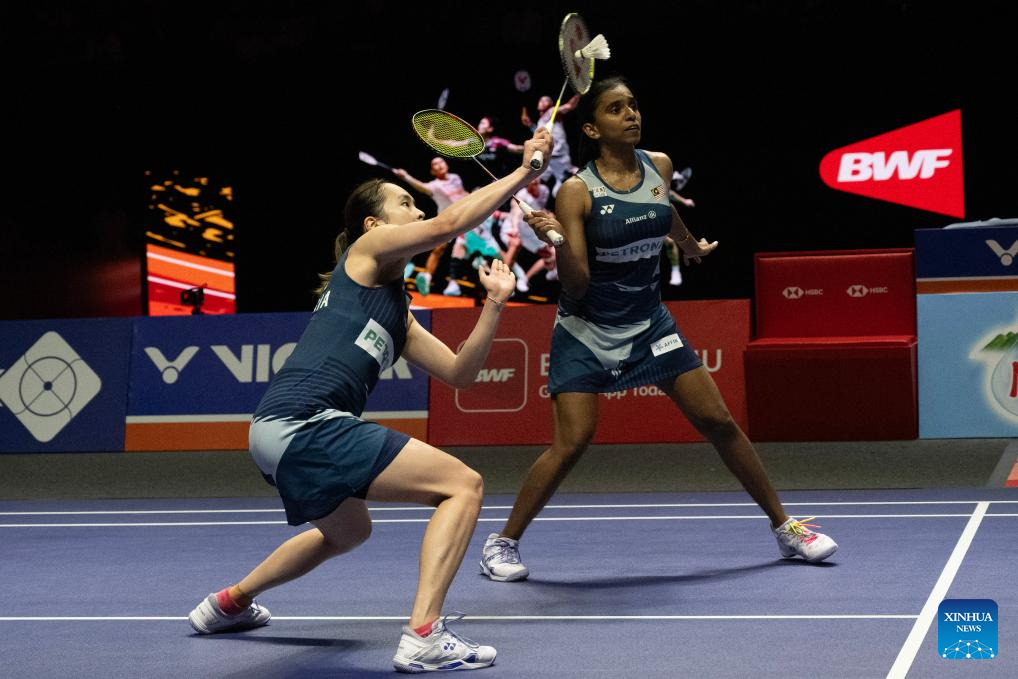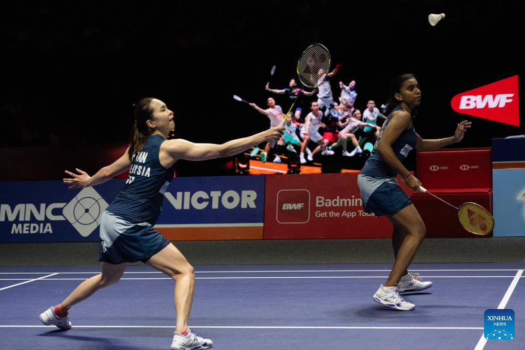Pearly Tan /Muralitharan Thinaah (L) of Malaysia compete against Li Yijing/Luo Xumin of China during their women's doubles semifinal match at Indonesia Open 2025 badminton tournament in Jakarta, Indonesia, June 7, 2025. (Xinhua/Veri Sanovri)