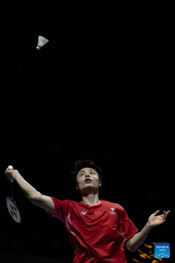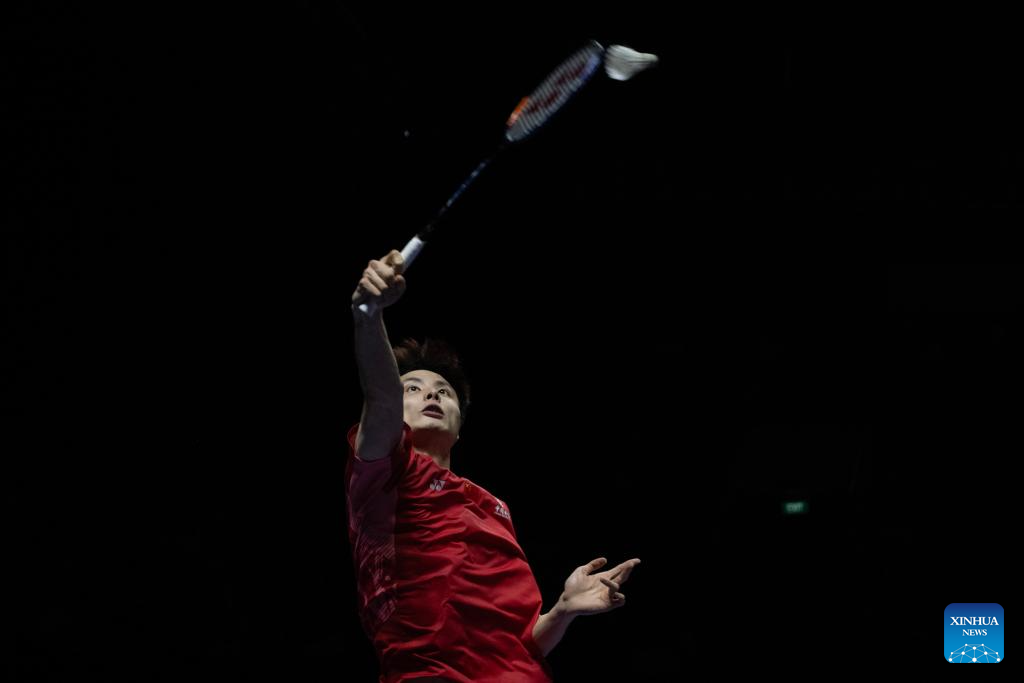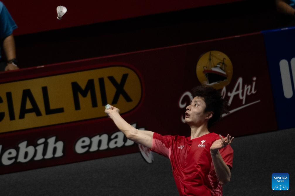 Shi Yuqi hits a return during the men's singles semi-final match between Shi Yuqi of China and Anders Antonsen of Denmark at Indonesia Open 2025 in Jakarta, Indonesia, June 7, 2025. (Xinhua/Veri Sanovri)