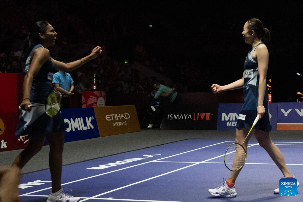 Pearly Tan (R)/Muralitharan Thinaah of Malaysia celebrate during the women's doubles semifinal match against Li Yijing/Luo Xumin of China at Indonesia Open 2025 badminton tournament in Jakarta, Indonesia, June 7, 2025. (Xinhua/Veri Sanovri)