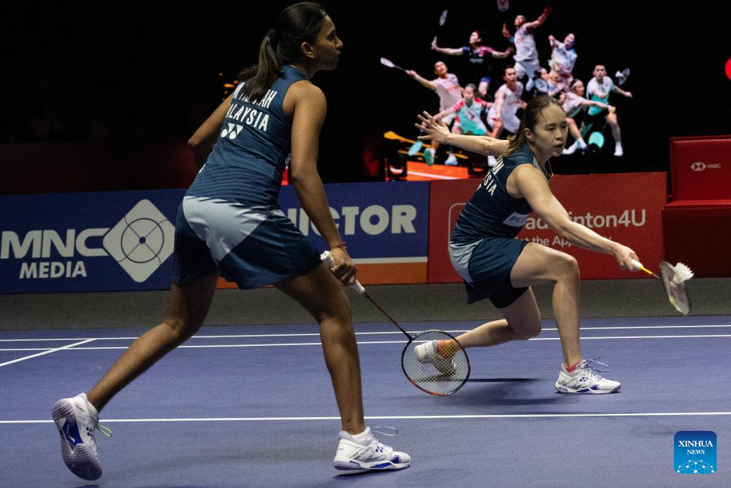 Pearly Tan (L)/Muralitharan Thinaah of Malaysia compete against Li Yijing/Luo Xumin of China during their women's doubles semifinal match at Indonesia Open 2025 badminton tournament in Jakarta, Indonesia, June 7, 2025. (Xinhua/Veri Sanovri)