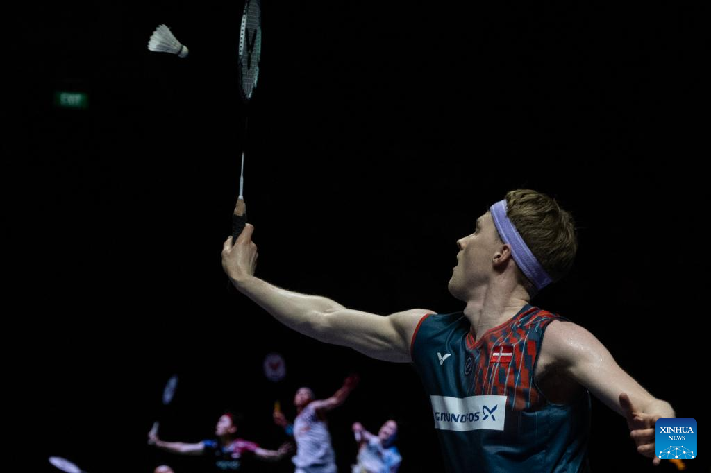 Anders Antonsen hits a return during the men's singles semi-final match between Shi Yuqi of China and Anders Antonsen of Denmark at Indonesia Open 2025 in Jakarta, Indonesia, June 7, 2025. (Xinhua/Veri Sanovri)