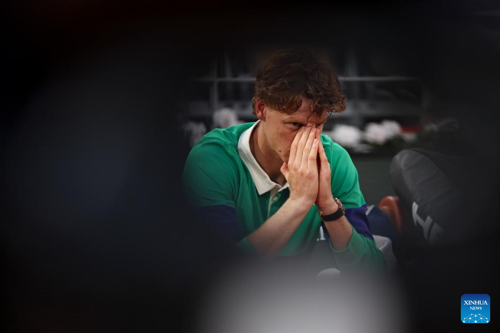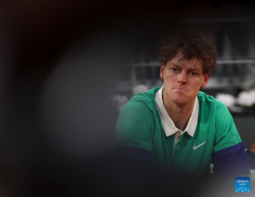 Jannik Sinner reacts after the men's singles final match between Jannik Sinner of Italy and Carlos Alcaraz of Spain at the French Open tennis tournament at Roland Garros, Paris, France, June 8, 2025. (Xinhua/Li Jing)