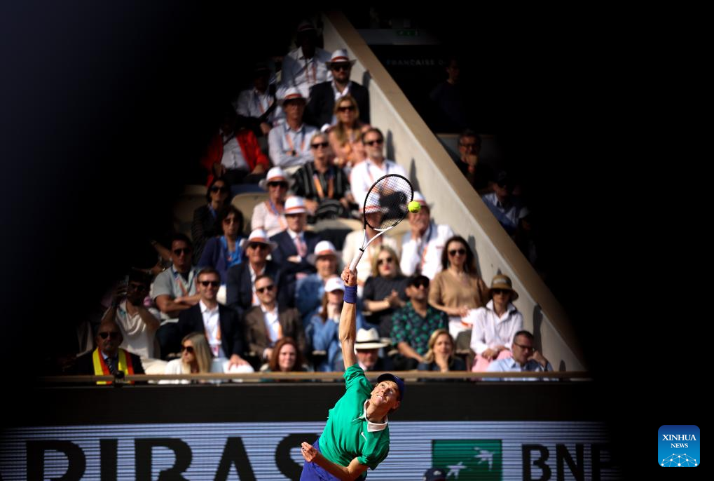 Jannik Sinner serves during the men's singles final match between Jannik Sinner of Italy and Carlos Alcaraz of Spain at the French Open tennis tournament at Roland Garros, Paris, France, June 8, 2025. (Xinhua/Li Jing)