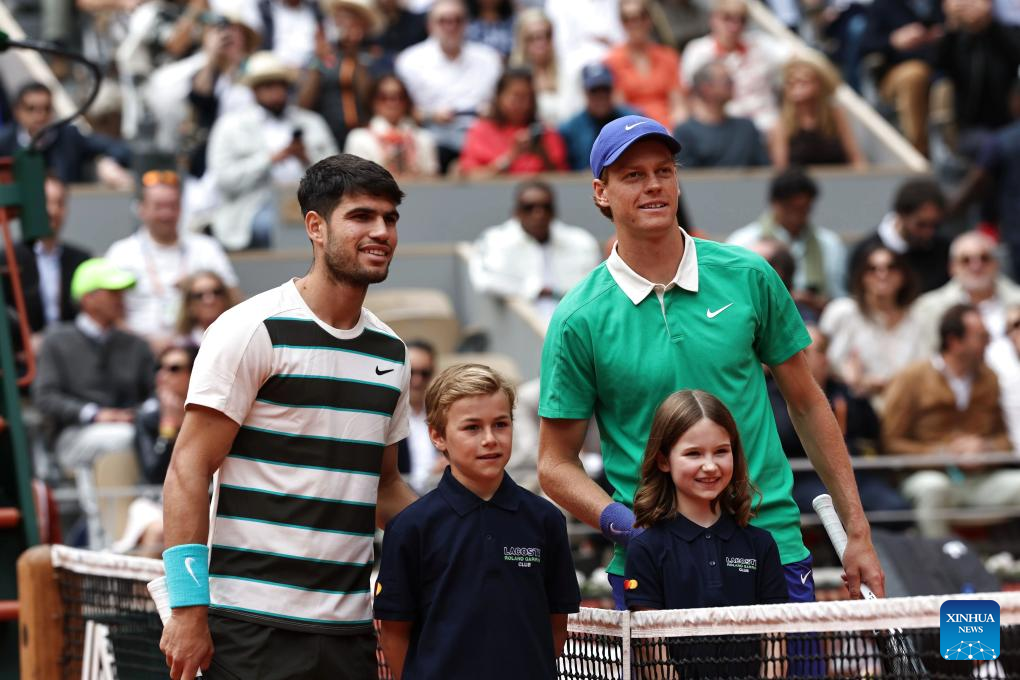Carlos Alcaraz (1st L) and Jannik Sinner (1st R) pose for photos before the men's singles final between Jannik Sinner of Italy and Carlos Alcaraz of Spain at the French Open tennis tournament at Roland Garros, Paris, France, June 8, 2025. (Xinhua/Li Jing)