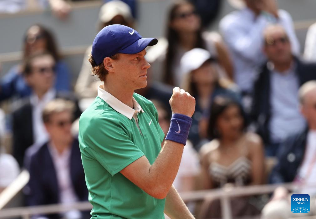 Jannik Sinner celebrates scoring during the men's singles final between Jannik Sinner of Italy and Carlos Alcaraz of Spain at the French Open tennis tournament at Roland Garros, Paris, France, June 8, 2025. (Xinhua/Li Jing)
