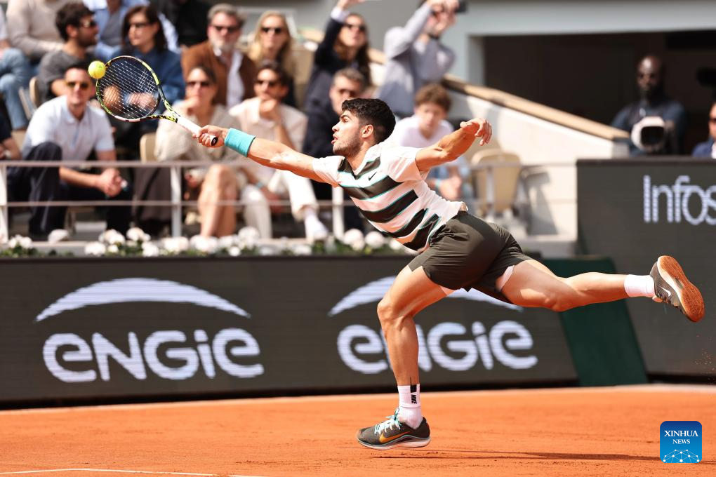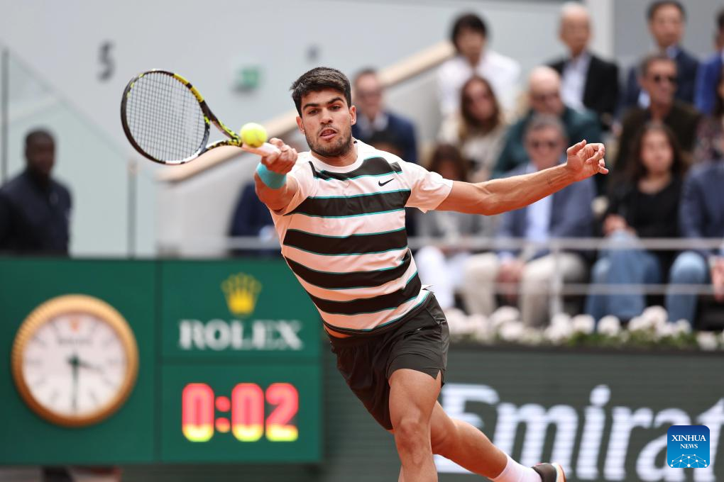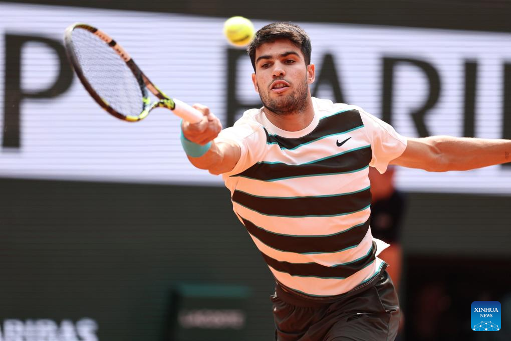 Carlos Alcaraz returns a shot during the men's singles final between Jannik Sinner of Italy and Carlos Alcaraz of Spain at the French Open tennis tournament at Roland Garros, Paris, France, June 8, 2025. (Xinhua/Li Jing)