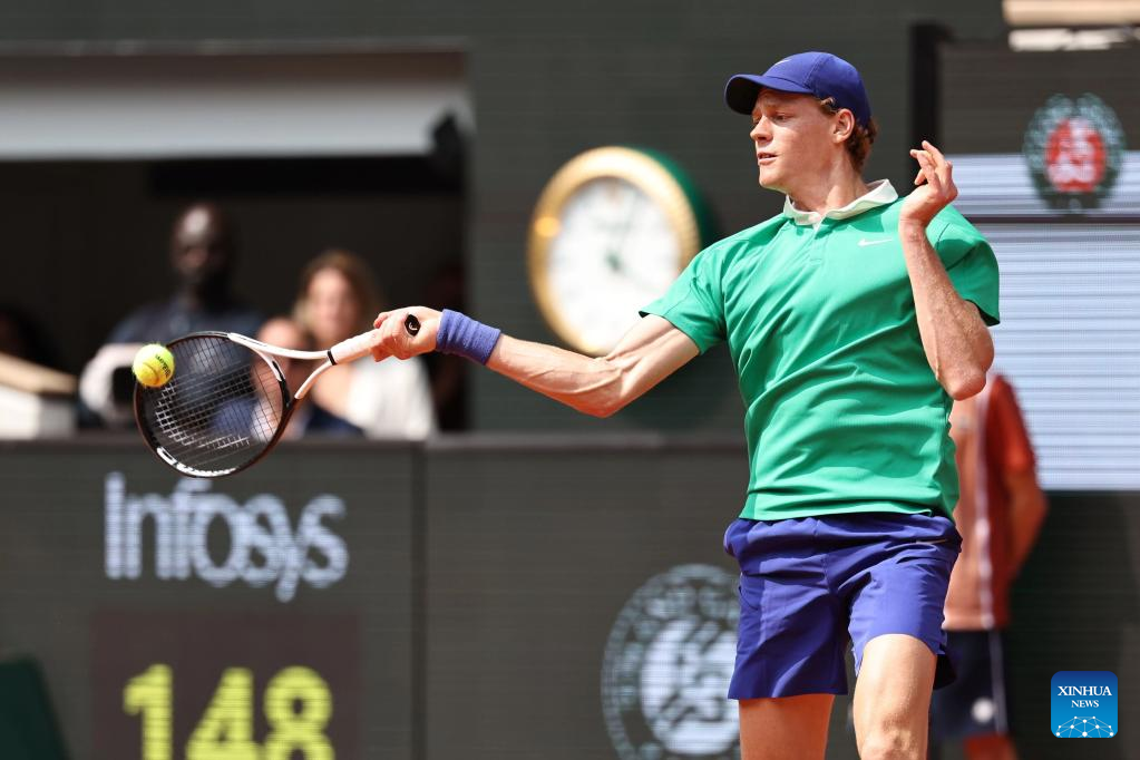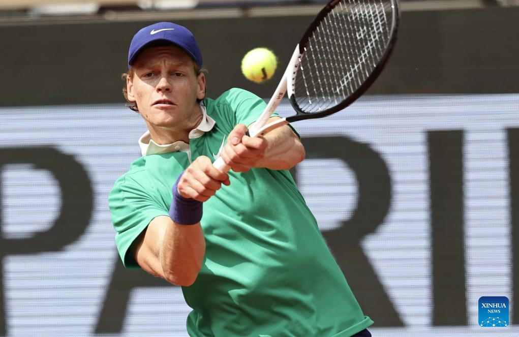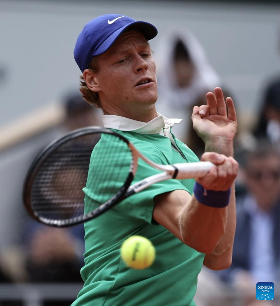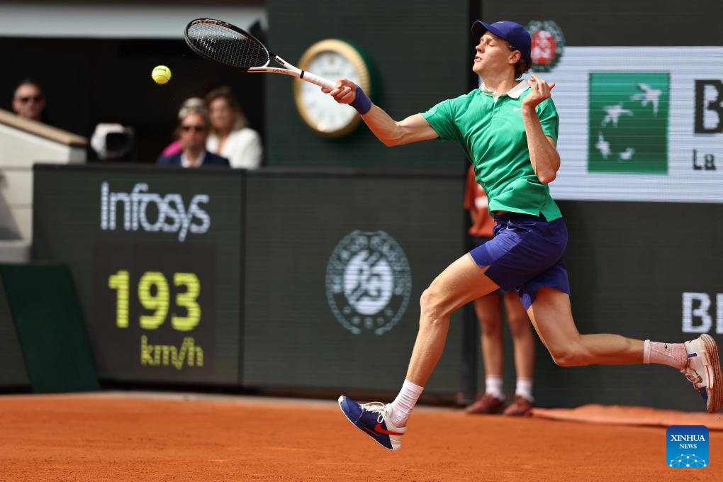 Jannik Sinner returns a shot during the men's singles final between Jannik Sinner of Italy and Carlos Alcaraz of Spain at the French Open tennis tournament at Roland Garros, Paris, France, June 8, 2025. (Xinhua/Li Jing)