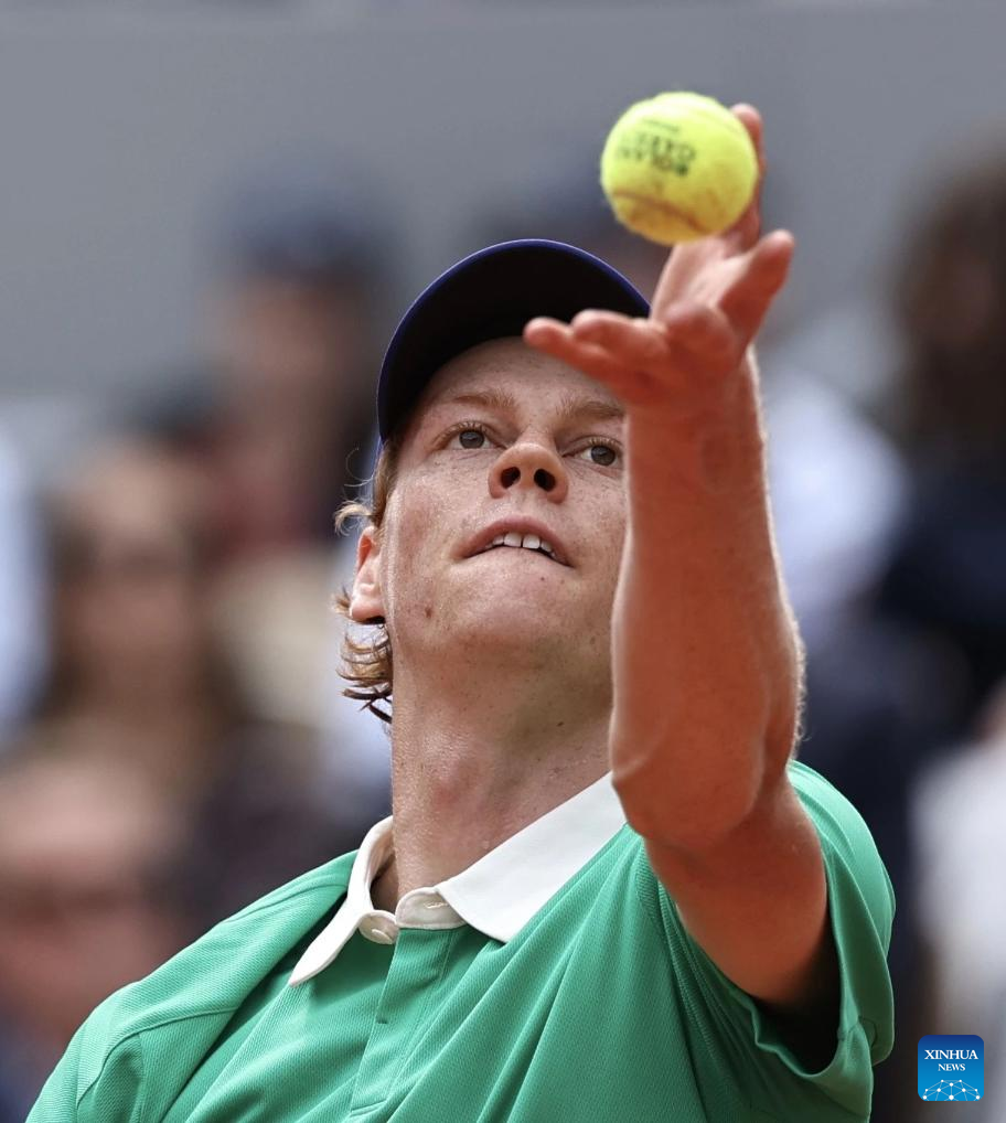Jannik Sinner serves during the men's singles final between Jannik Sinner of Italy and Carlos Alcaraz of Spain at the French Open tennis tournament at Roland Garros, Paris, France, June 8, 2025. (Xinhua/Li Jing)