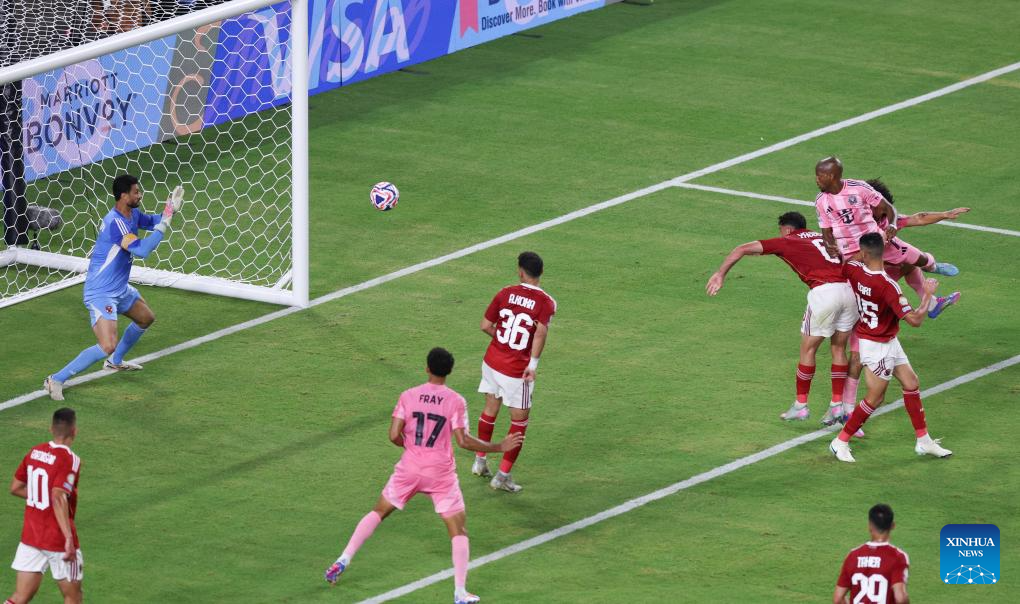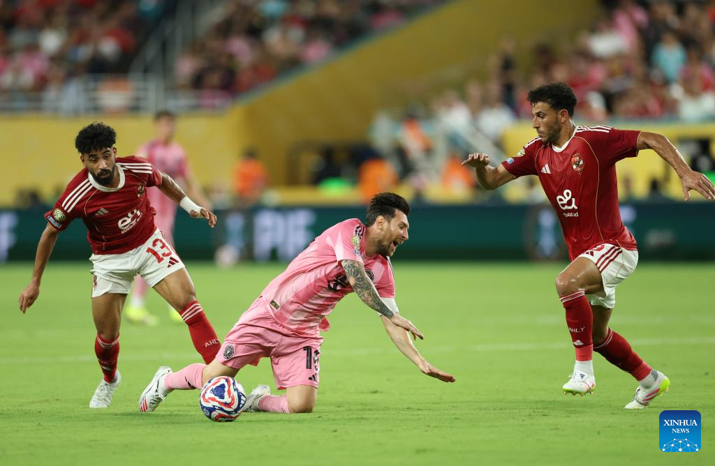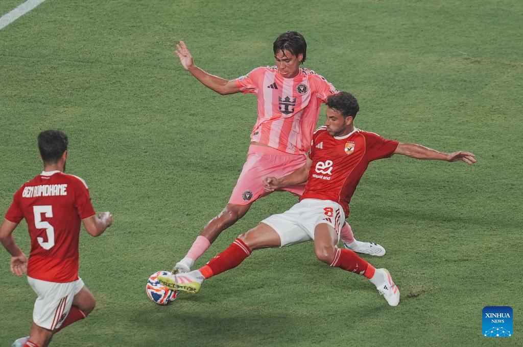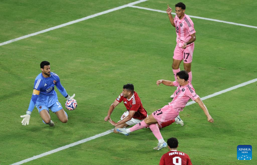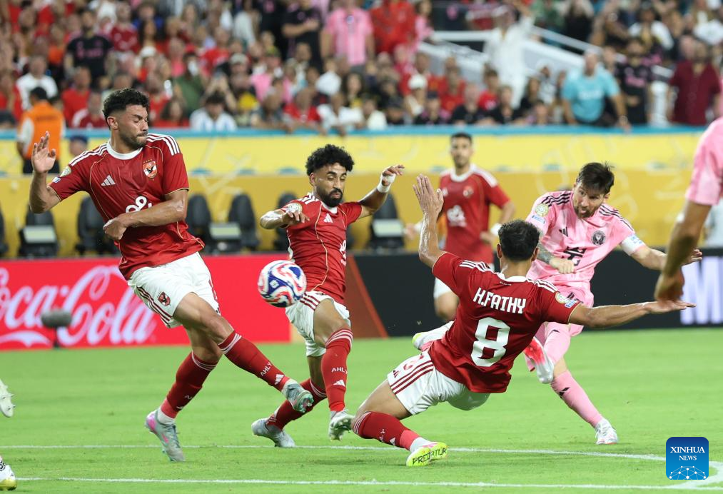 Wessam Abou Ali (3rd L) of Al Ahly defends during the opening match between Inter Miami CF of the United States and Al Ahly of Egypt at the FIFA Club World Cup 2025 in Miami, the United States, on June 14, 2025. (Xinhua/Li Ming)
