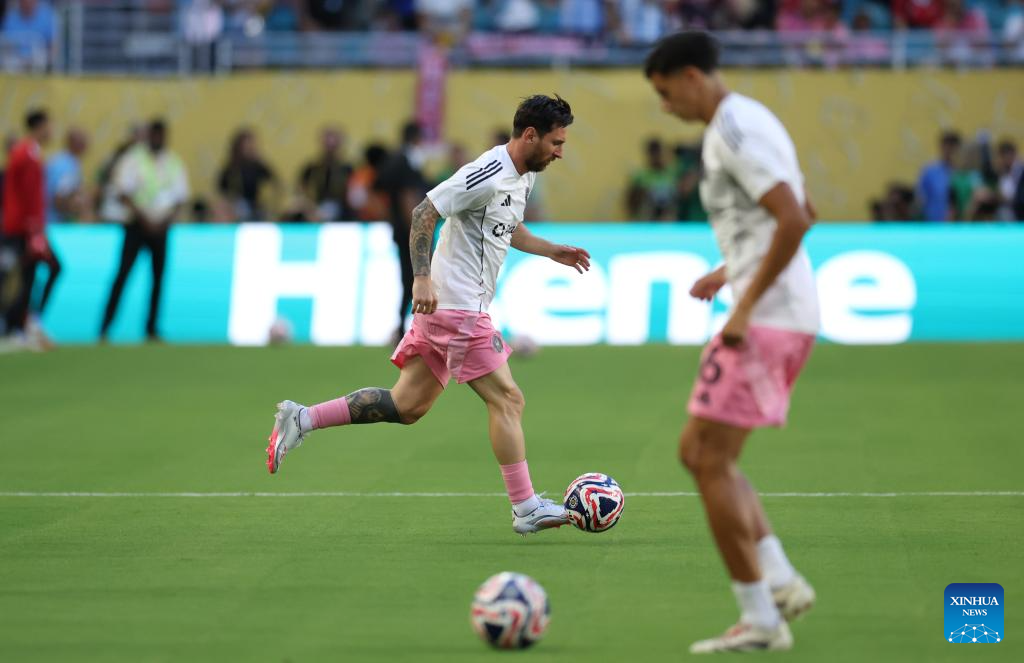 Lionel Messi (L) of Inter Miami CF warms up before the opening match between Inter Miami CF of the United States and Al Ahly of Egypt at the FIFA Club World Cup 2025 in Miami, the United States, on June 14, 2025. (Xinhua/Li Ming)