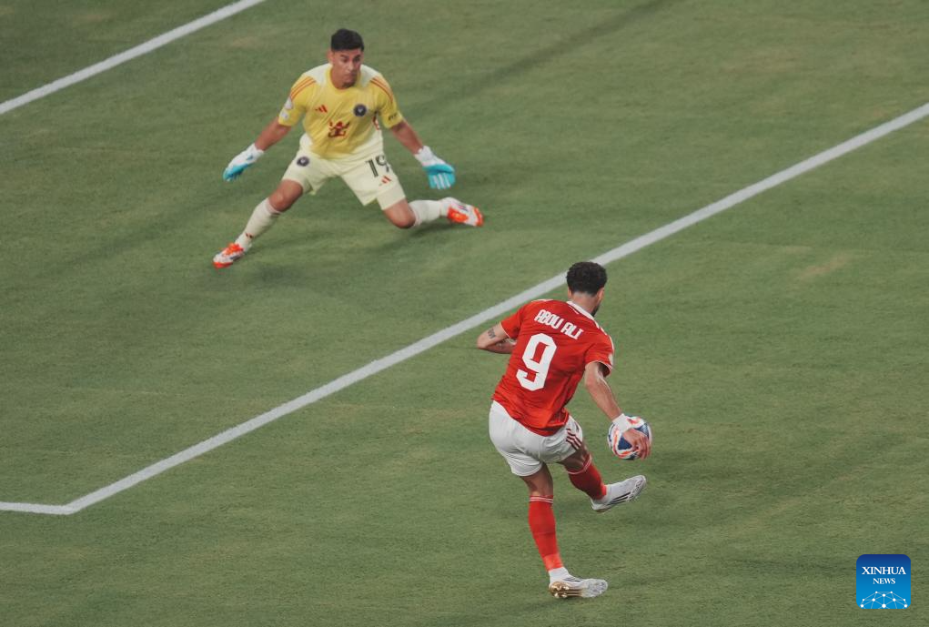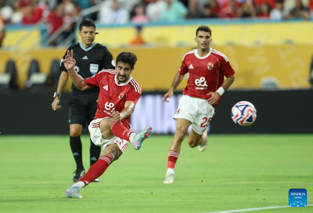 Wessam Abou Ali (R) of Al Ahly shoots during the opening match between Inter Miami CF of the United States and Al Ahly of Egypt at the FIFA Club World Cup 2025 in Miami, the United States, on June 14, 2025. (Xinhua/Huang Zongzhi)