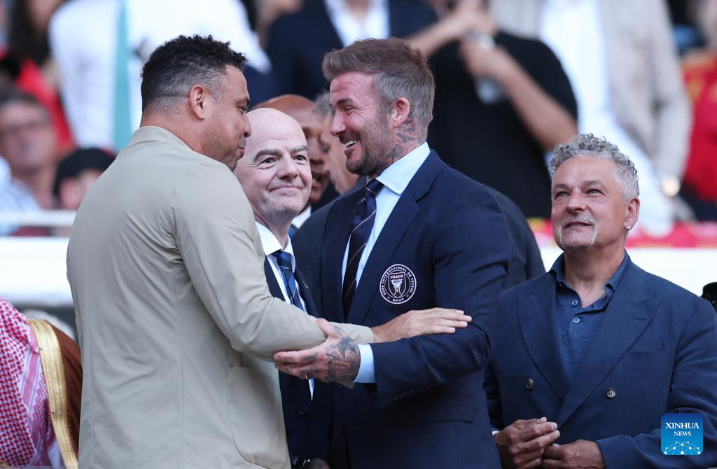 (from L to R) Brazilian football legend Ronaldo Nazario, FIFA President Gianni Infantino, English football legend and Inter Miami FC's co-owner David Beckham, Italian football legend Roberto Baggio react before the opening match between Inter Miami CF of the United States and Al Ahly of Egypt at the FIFA Club World Cup 2025 in Miami, the United States, on June 14, 2025. (Xinhua/Li Ming)